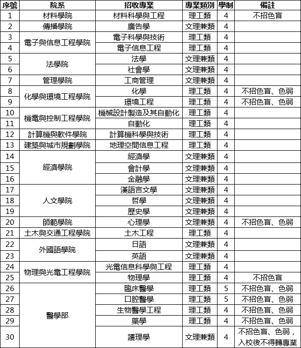 具體招生專業詳見下表。專業介紹及專業受限請參閱“深圳大學全日制本科招生專業介紹”(https://zs.szu.edu.cn/page?m=yxzy&c=00060001)。