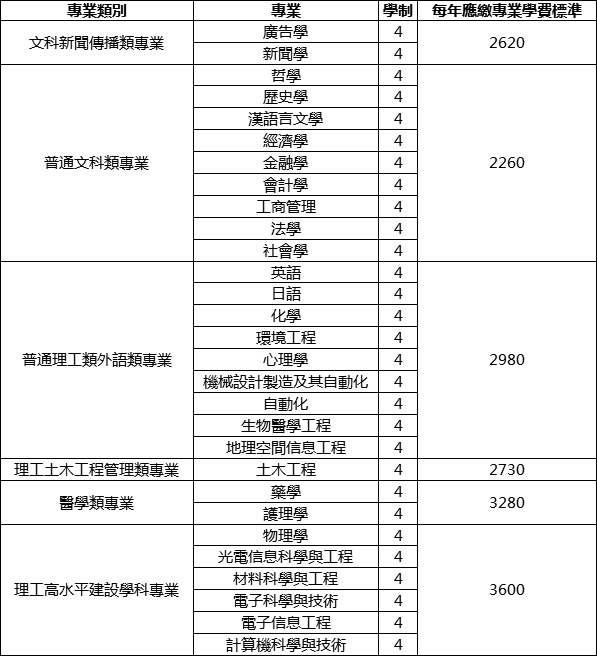 (一)學費(不含書費):按學分制收費,由課程學分學費和專業學費兩部分組成,每學期學生繳納學分學費按學生實際修讀的課程總學分計算(課程學分學費的標準為每學分100元);