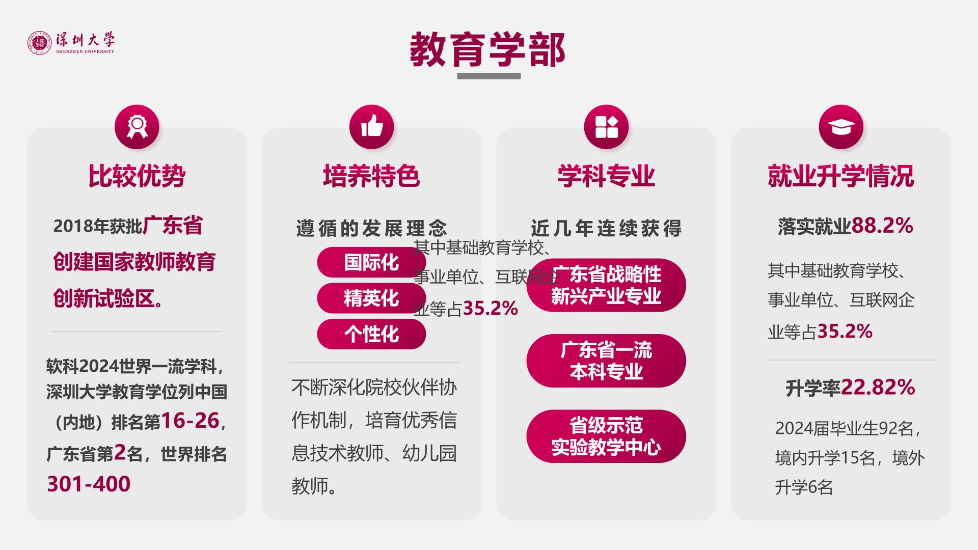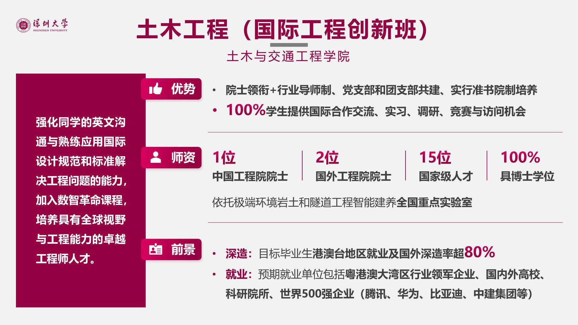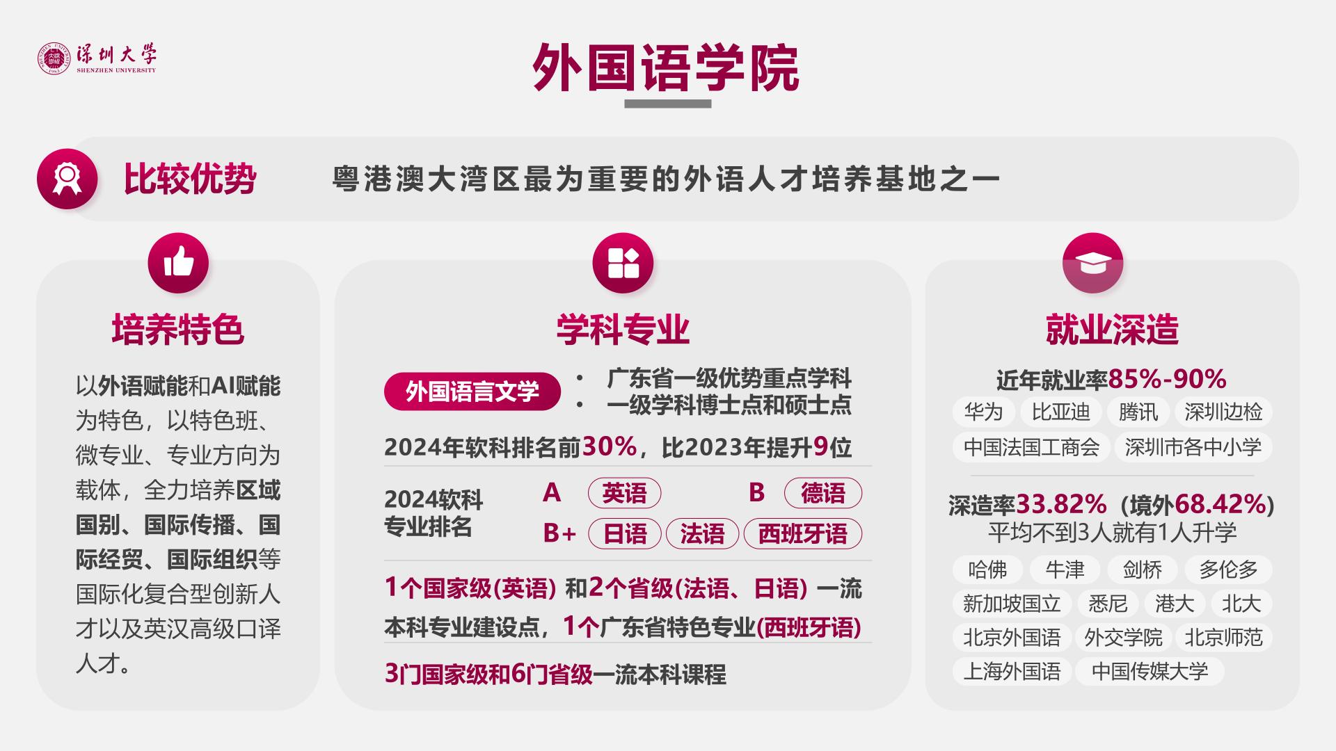 【就业深造】毕业生就业主要面向深圳市和粤港澳大湾区的高新技术企业和事业单位,包括华为、大疆、华星光电、比亚迪和通产丽星等知名企业,初次就业率高,深造率高,2023届毕业生深造率54.1%,英才班高达88.89%。