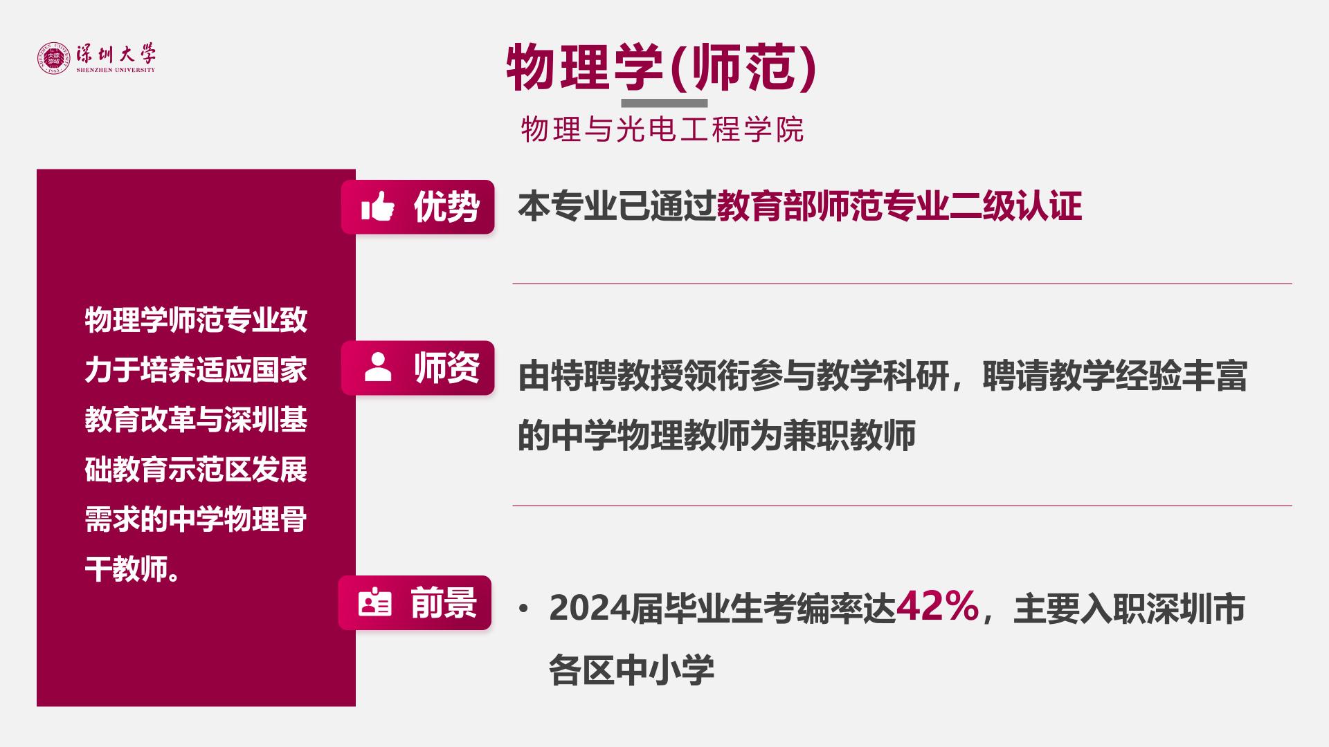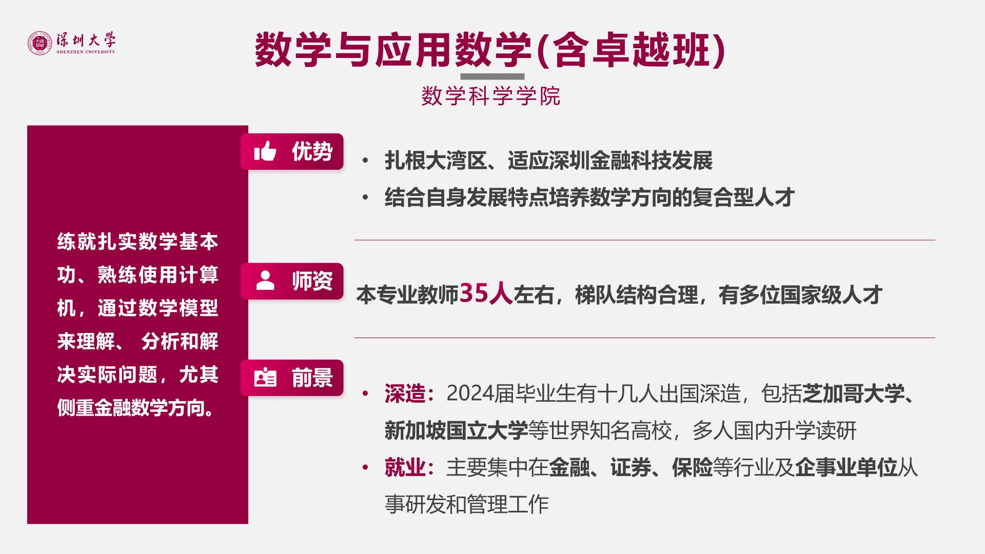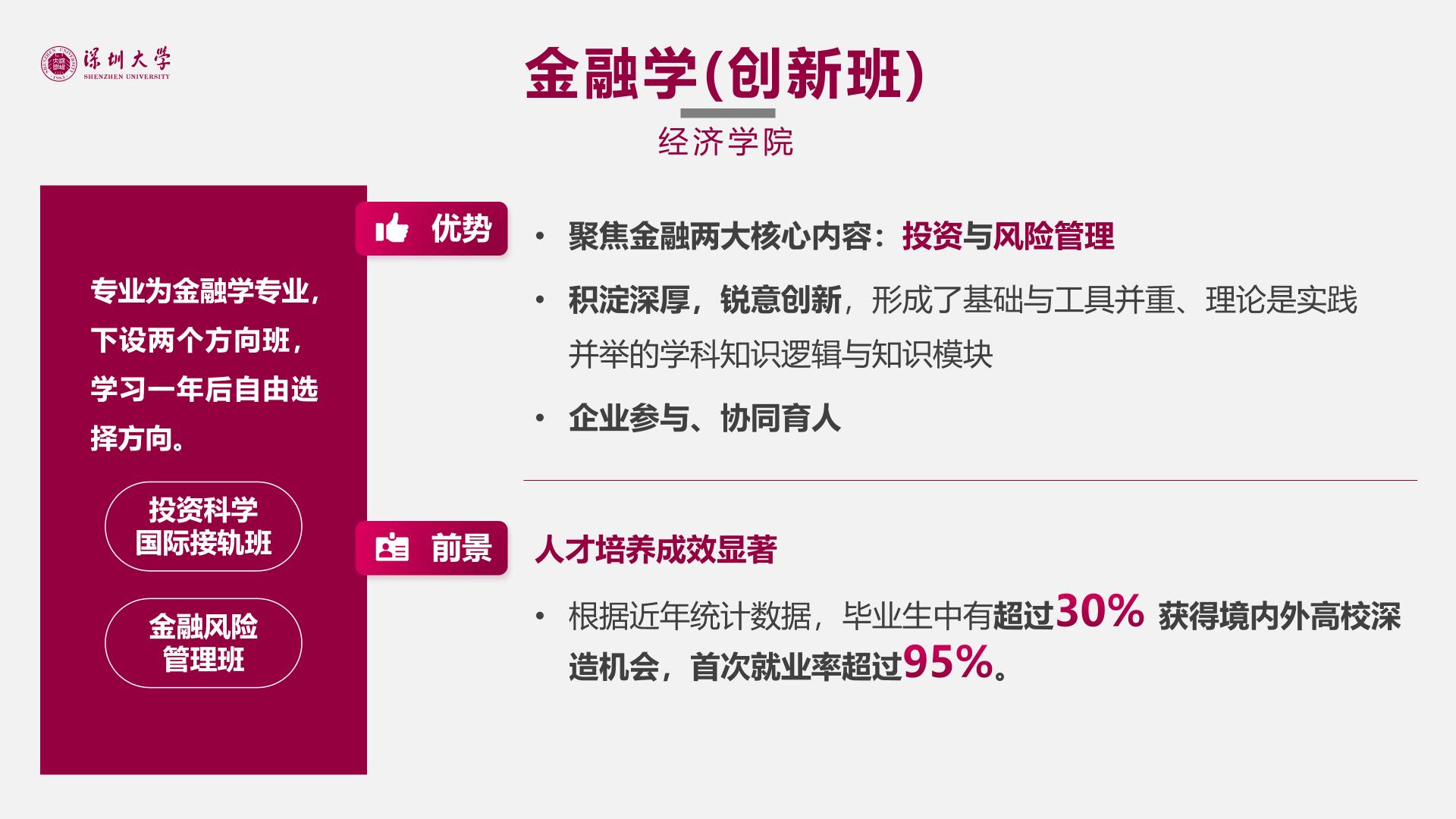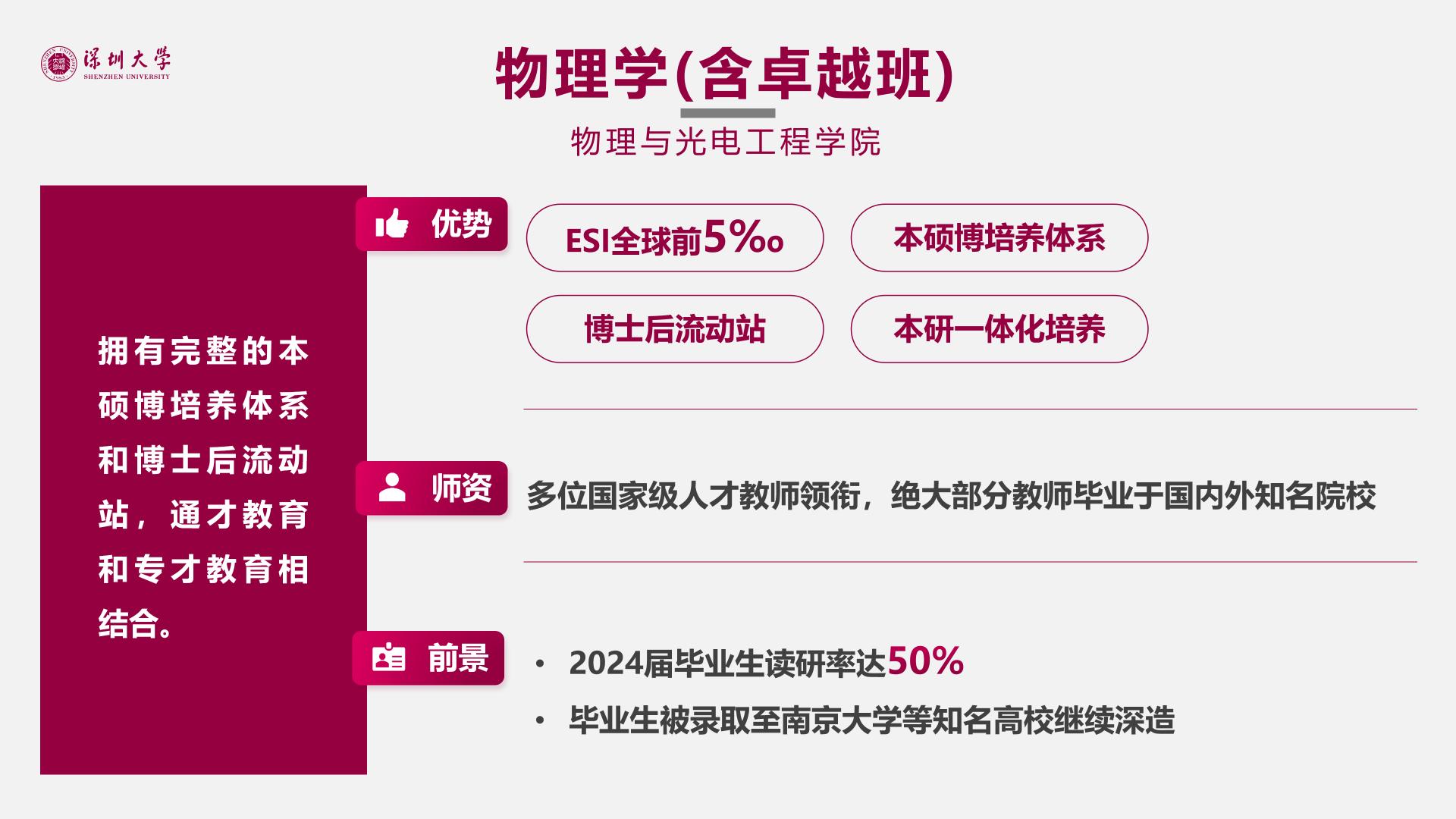 【就业深造】毕业生就业主要面向深圳市和粤港澳大湾区的高新技术企业和事业单位,包括华为、大疆、华星光电、比亚迪和通产丽星等知名企业,初次就业率高,深造率高,2023届毕业生深造率54.1%,英才班高达88.89%。