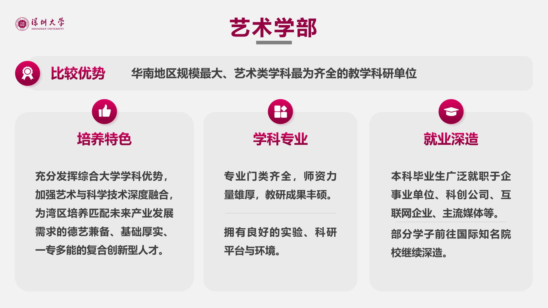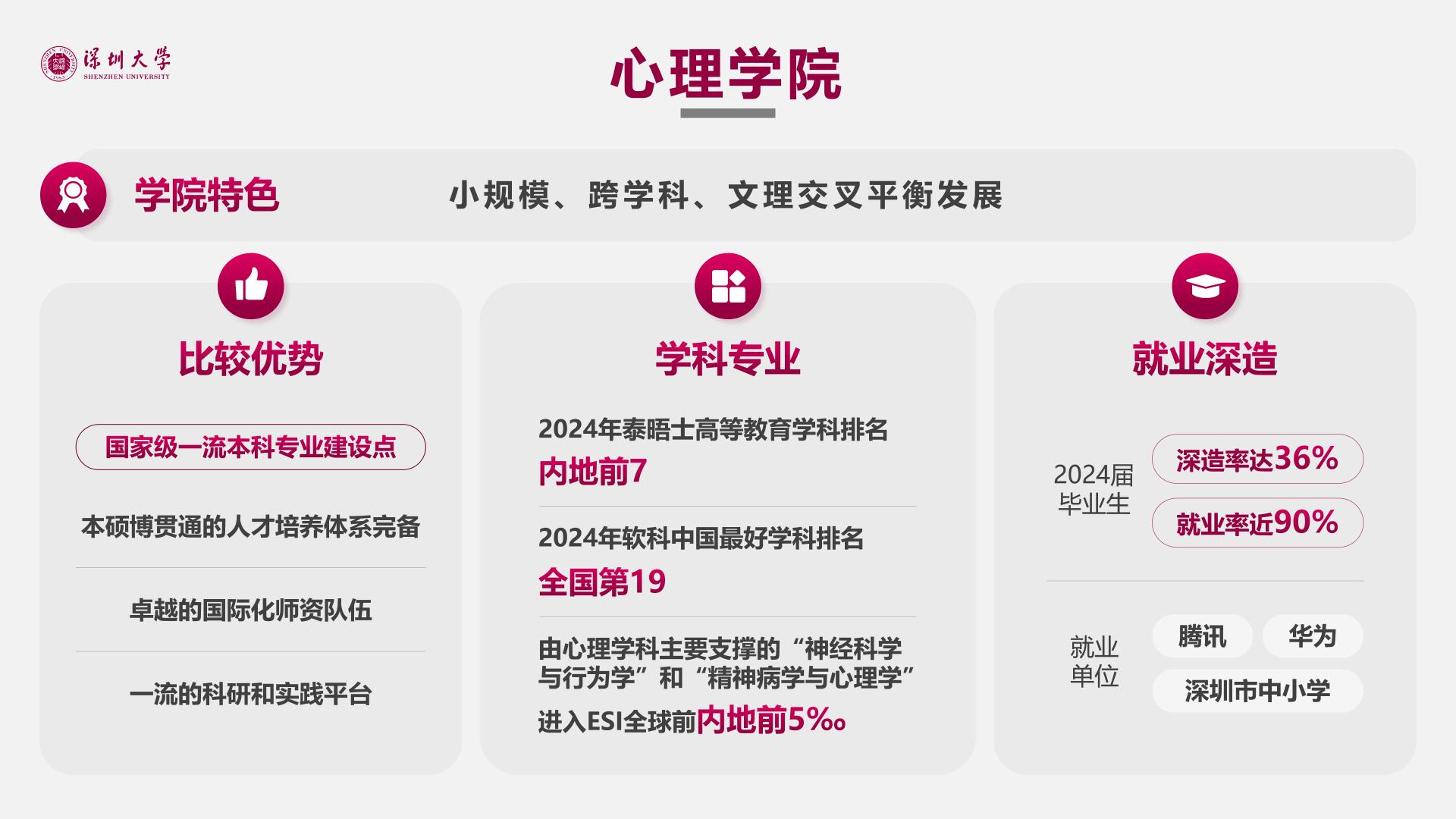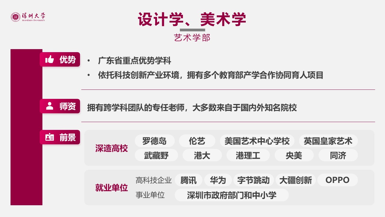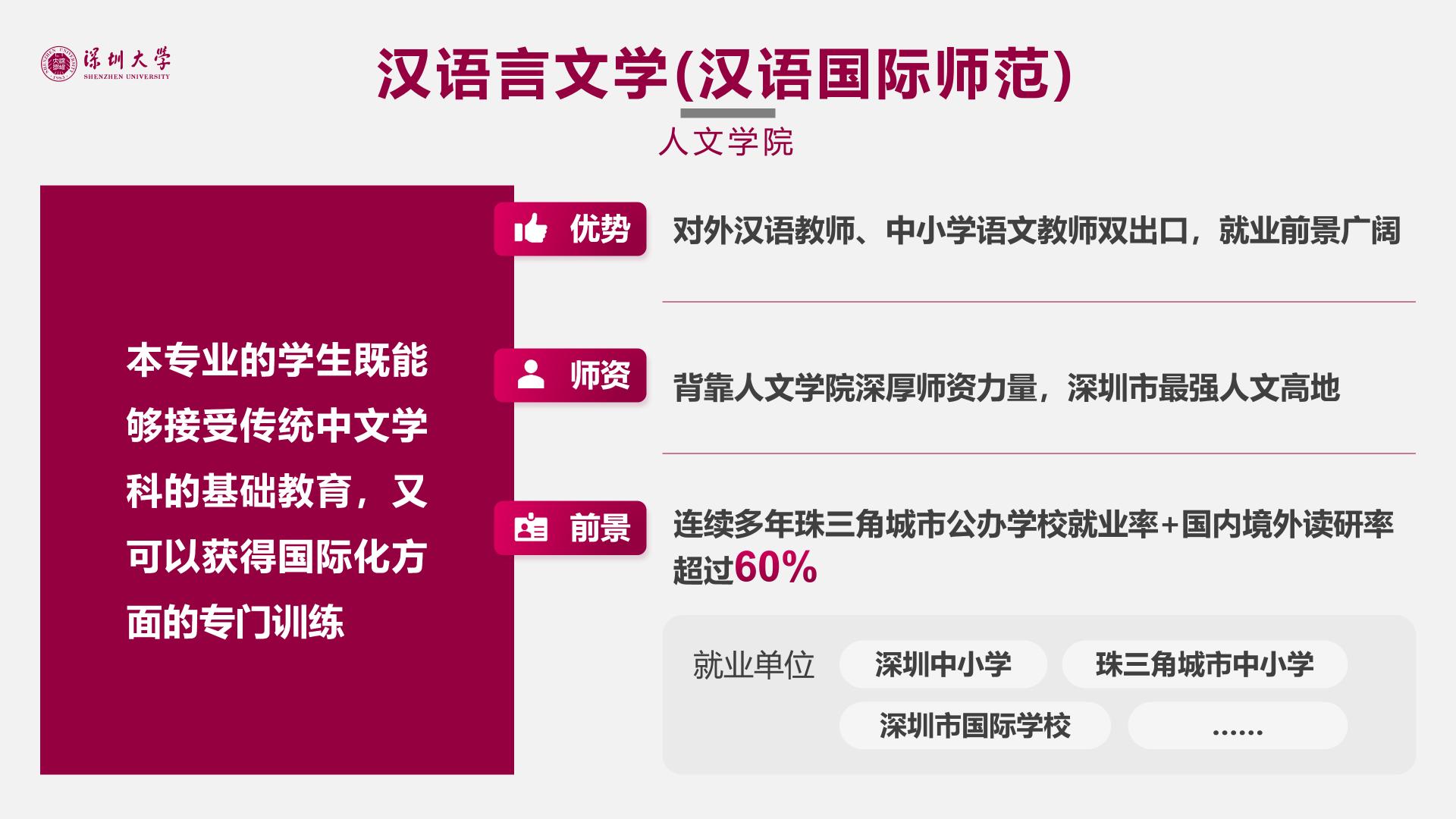 【就业】学生就业广泛,包括腾讯、字节跳动等互联网企业,深圳广电集团、深圳报业等媒体单位,法国阳狮集团、奥美集团、日本电通等国内外知名单位;近三届毕业生对母校的推介程度均超过96%,位居全校首位。