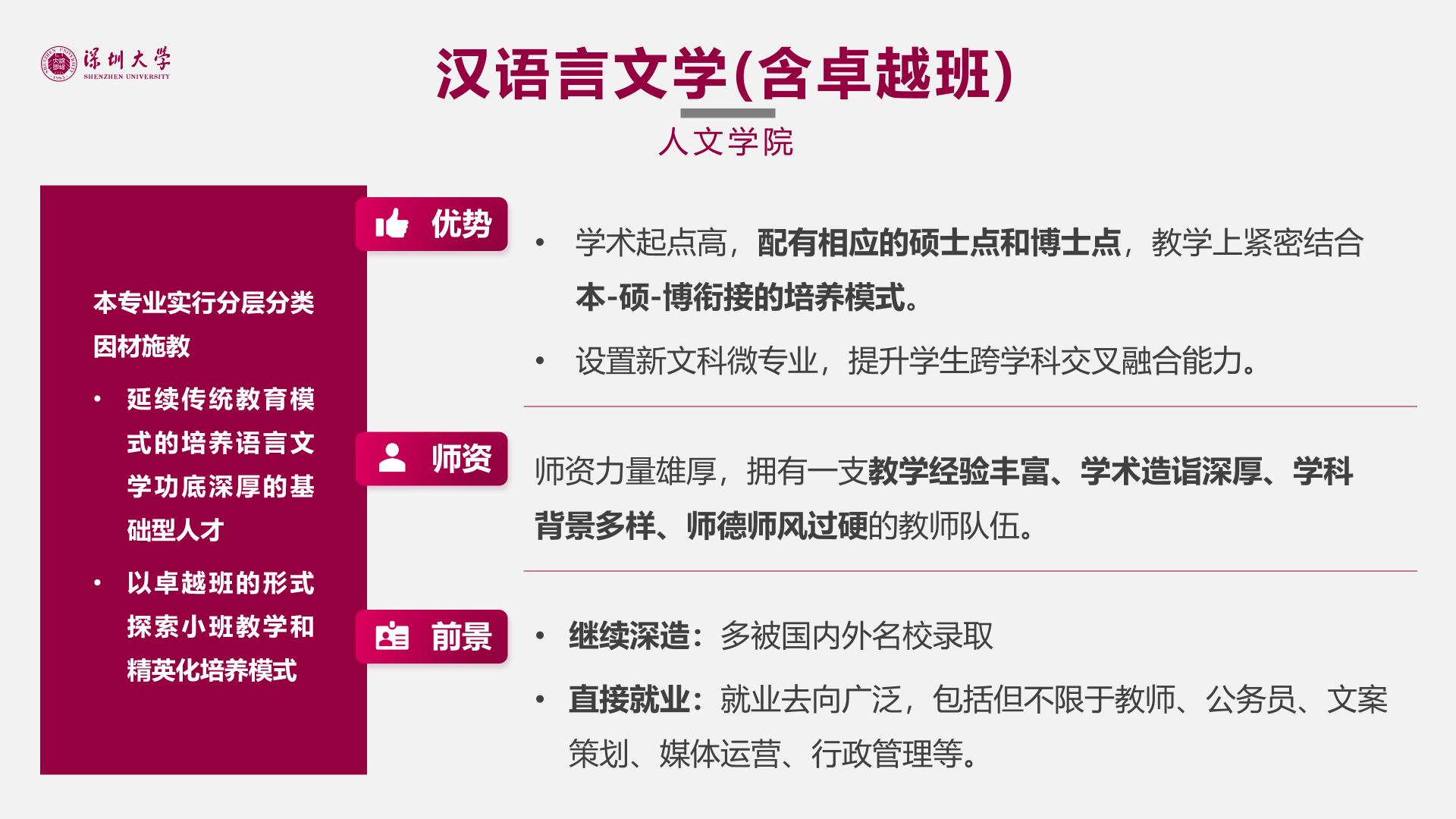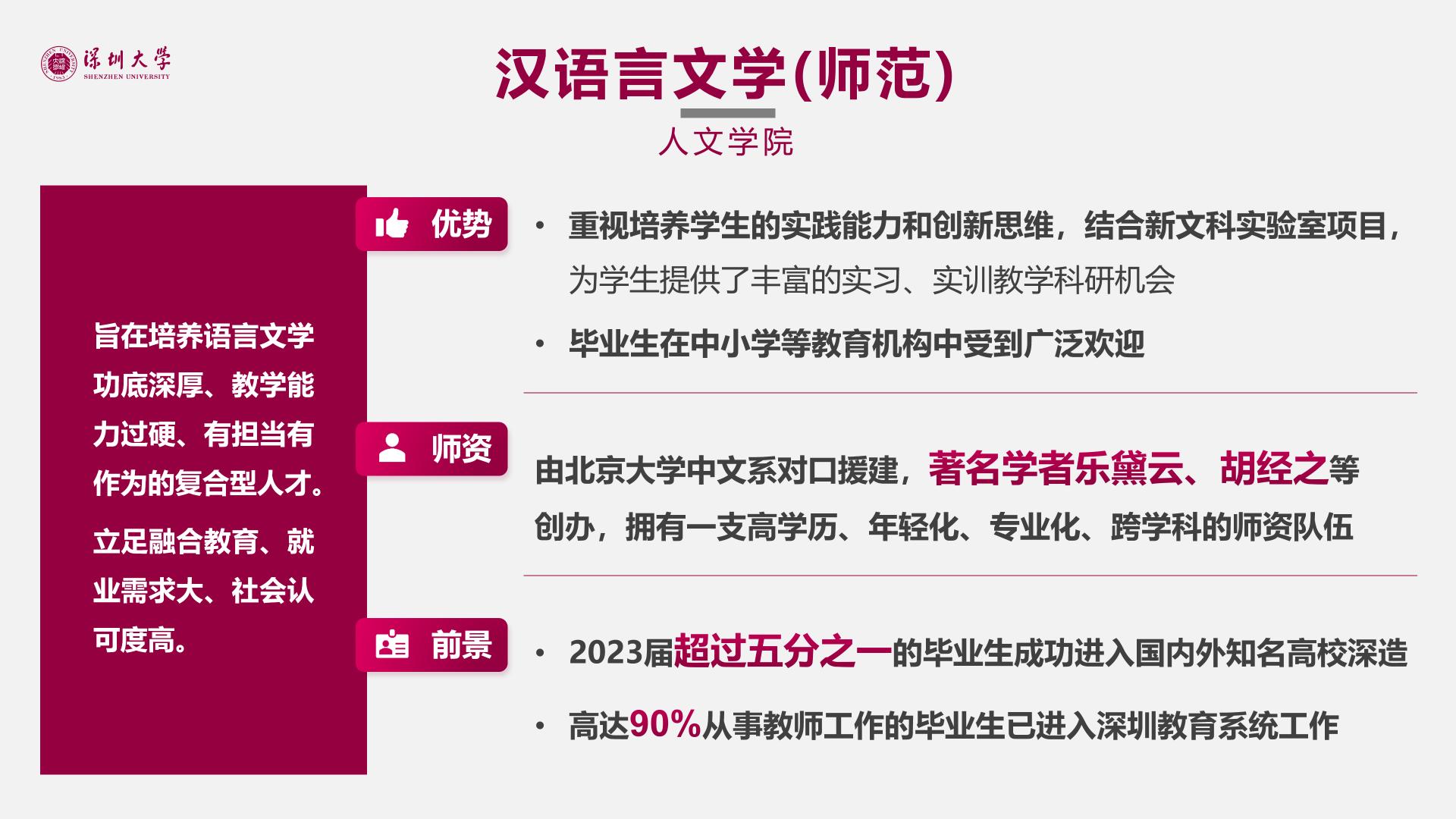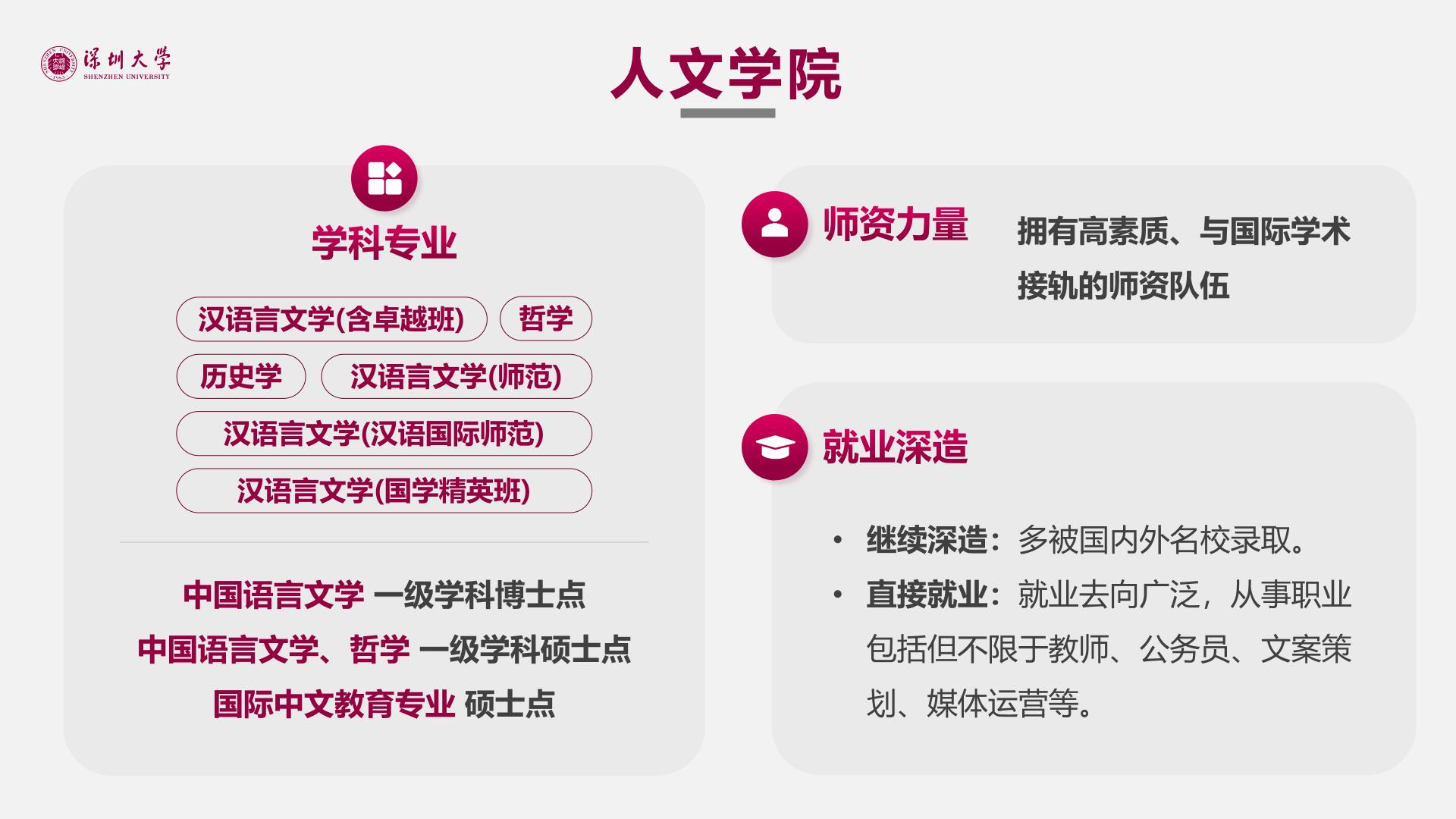 【就业】学生就业广泛,包括腾讯、字节跳动等互联网企业,深圳广电集团、深圳报业等媒体单位,法国阳狮集团、奥美集团、日本电通等国内外知名单位;近三届毕业生对母校的推介程度均超过96%,位居全校首位。