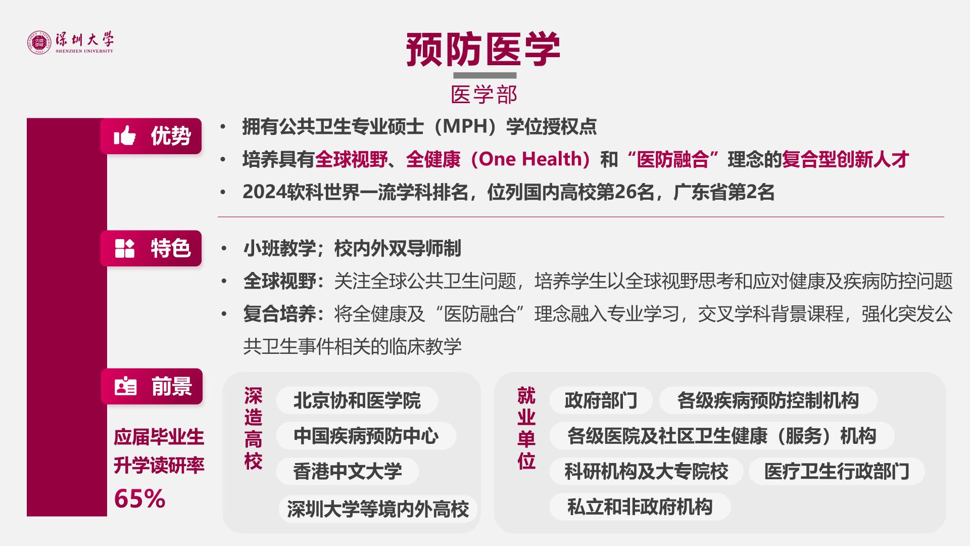 读研升学率65%(前往北京协和医学院、香港中文大学、中山大学、深圳大学等境内外高校深造);部分学生前往各级疾病预防控制机构、各级医院及社区卫生健康(服务)机构、科研机构及大专院校、医疗卫生行政部门、私立和非政府机构等就业。