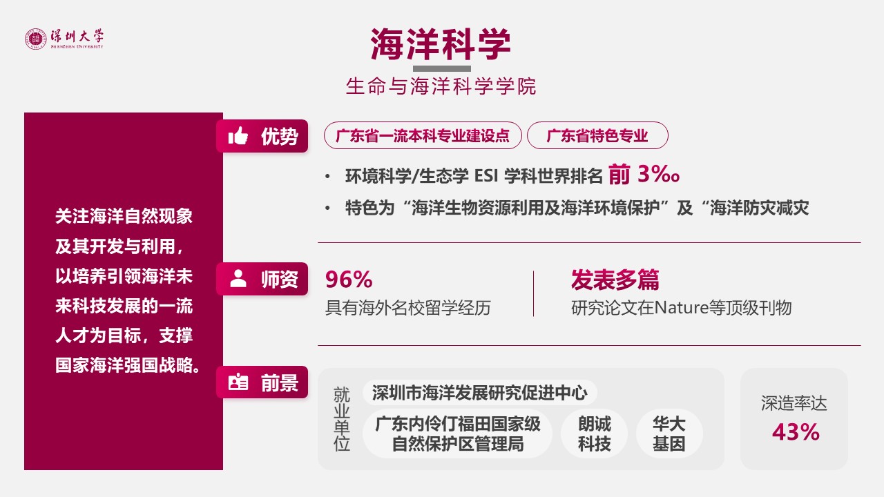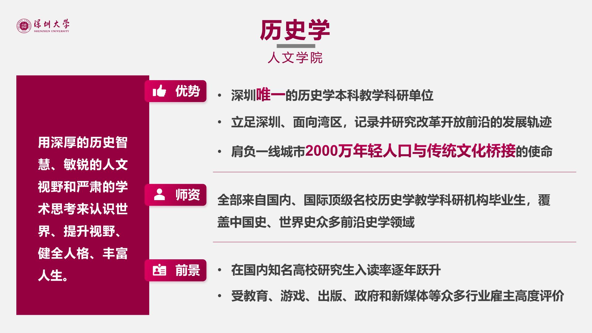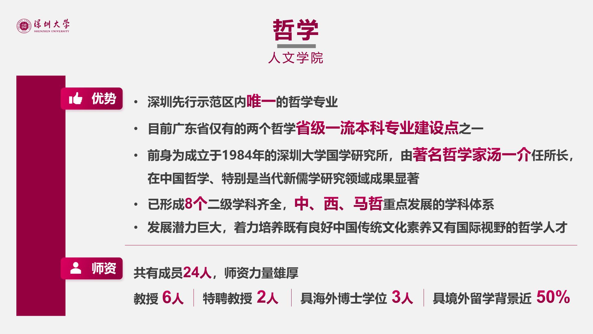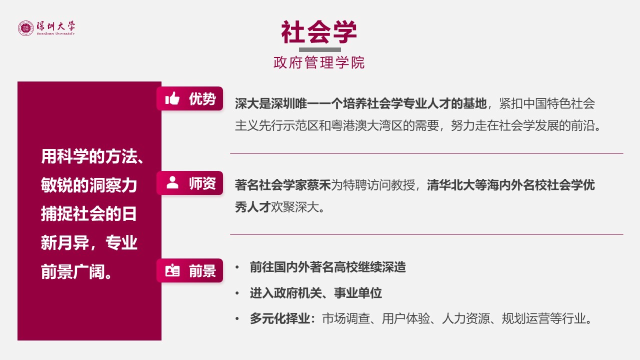 【优势】深大是深圳唯一一个培养社会学专业人才的基地,紧扣中国特色社会主义先行示范区和粤港澳大湾区的需要,努力走在社会学发展的前沿。