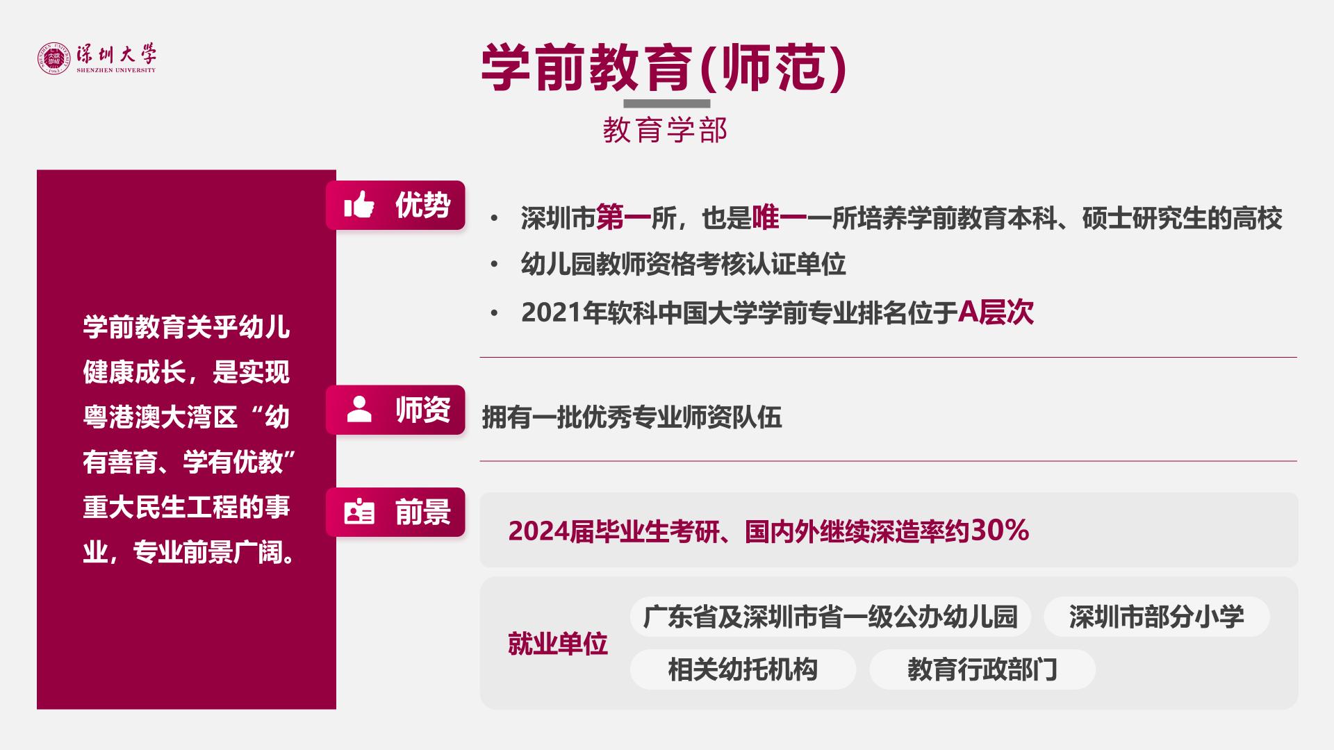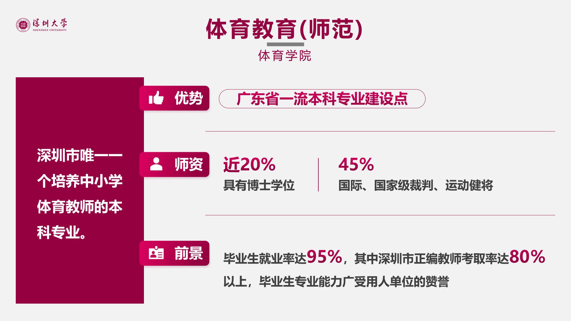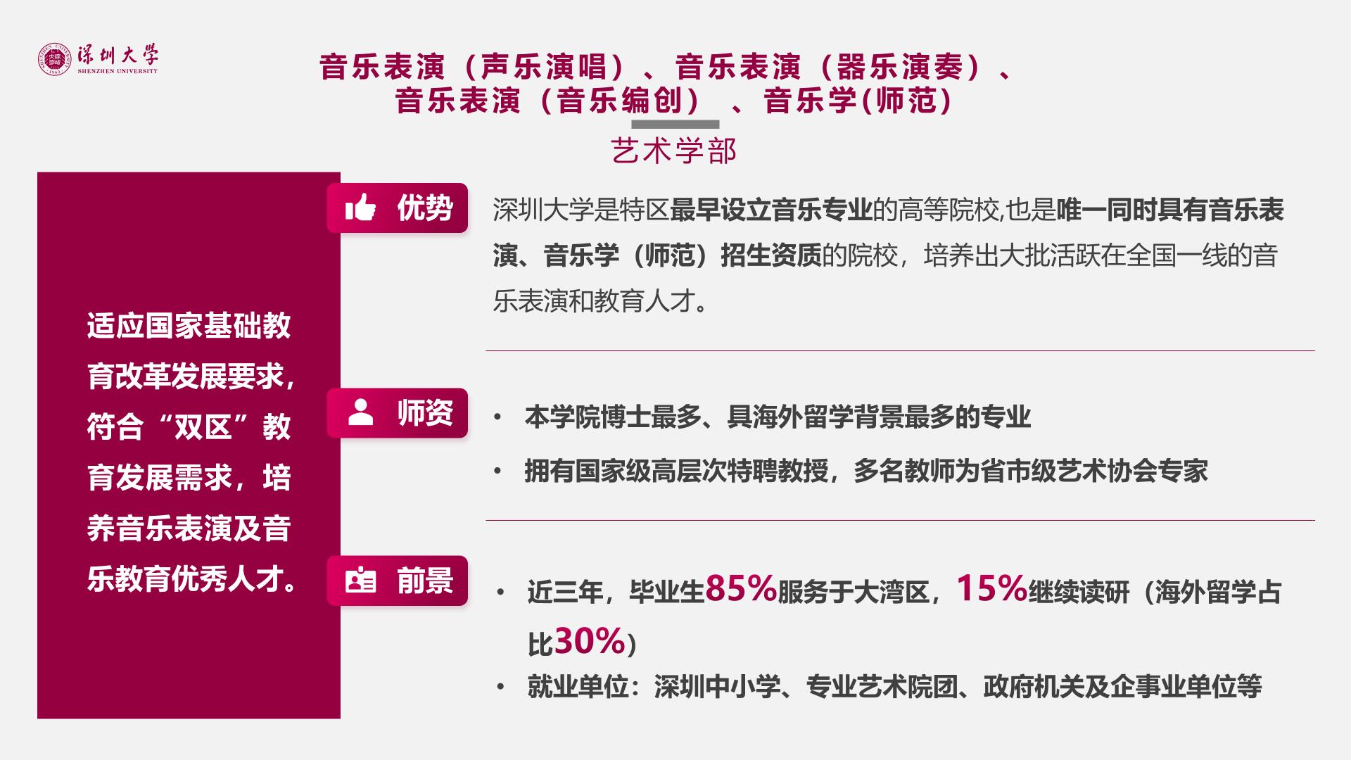 【优势】深圳大学是特区最早设立音乐专业的高等院校,也是唯一同时具有音乐表演、音乐学(师范)招生资质的院校,培养出大批活跃在全国一线的音乐表演和教育人才。