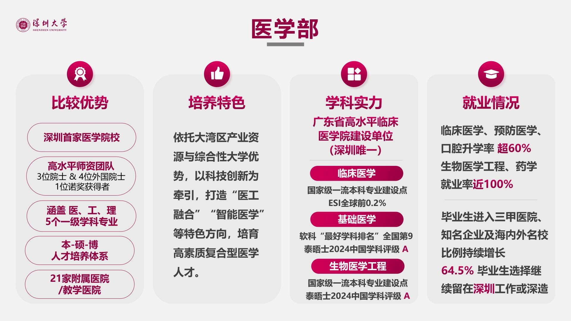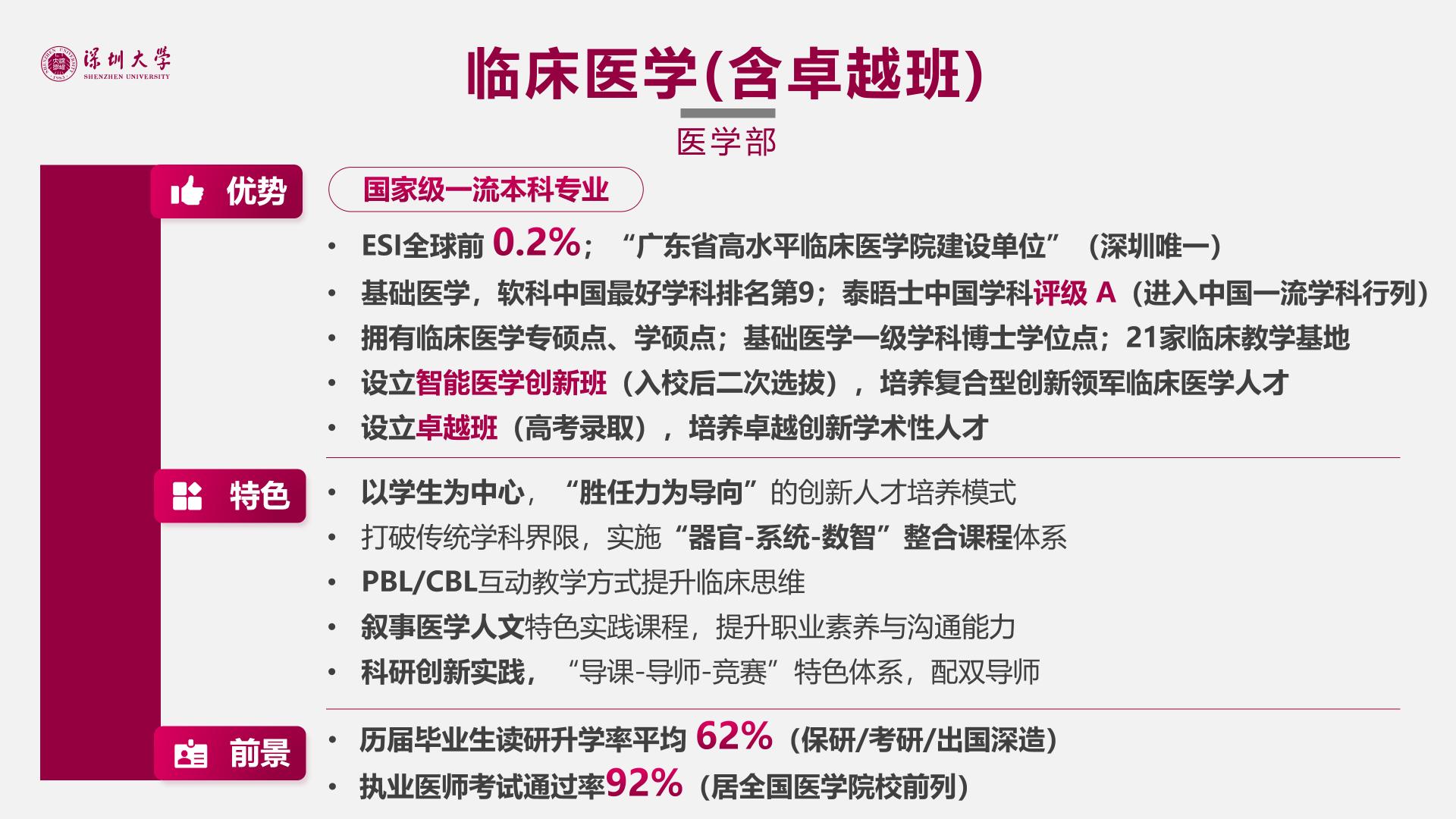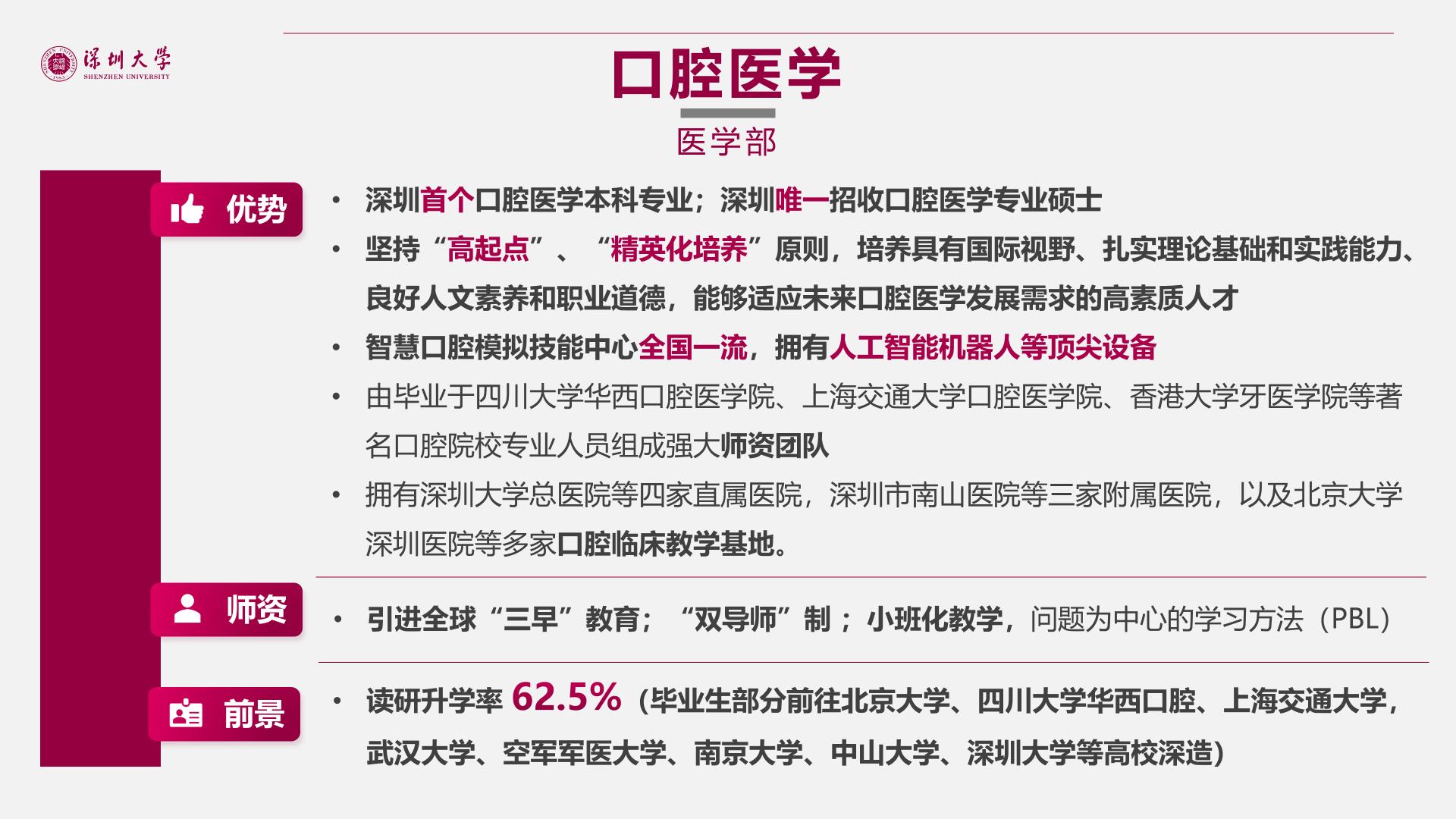 【优势】深大是深圳市唯一开设口腔医学本科专业的高等院校,智慧口腔模拟技能中心全国一流。立足深圳特区,就业前景光明。
