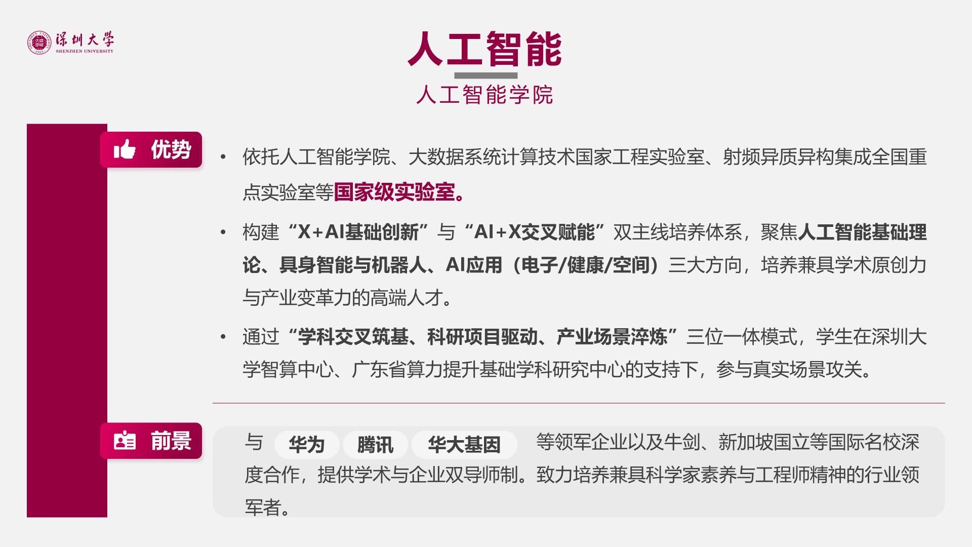 依托人工智能学院、大数据系统计算技术国家工程实验室、射频异质异构集成全国重点实验室等国家级实验室,构建“X+AI基础创新”与“AI+X交叉赋能”双主线培养体系,聚焦人工智能基础理论、具身智能与机器人、AI应用(电子/健康/空间)三大方向,培养兼具学术原创力与产业变革力的高端人才。通过“学科交叉筑基、科研项目驱动、产业场景淬炼”三位一体模式,学生在深圳大学智算中心、广东省算力提升基础学科研究中心的支持下,参与真实场景攻关。与华为、腾讯、华大等领军企业以及牛剑、新加坡国立国际名校深度合作,提供学术与企业双导师制,致力培养兼具科学家素养与工程师精神的行业领军者。