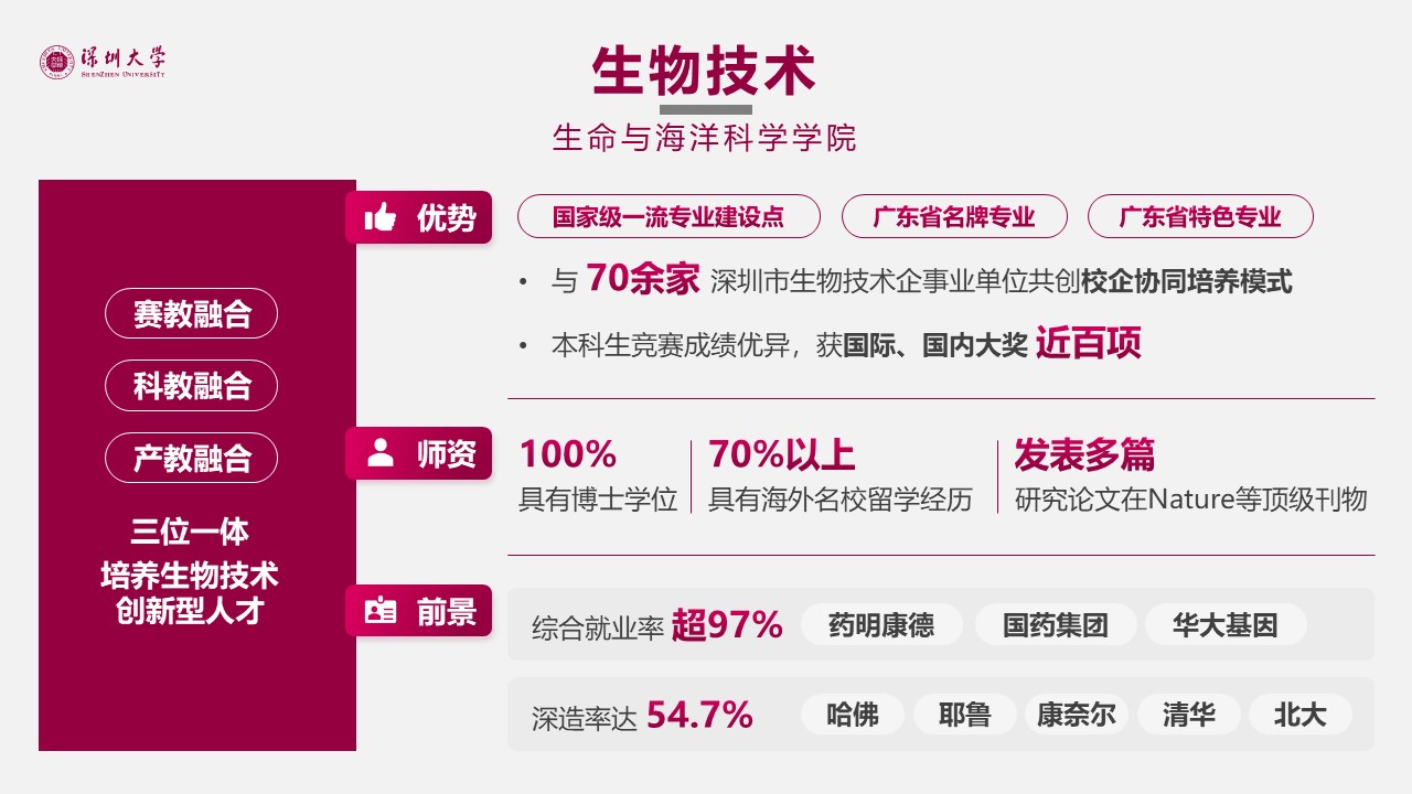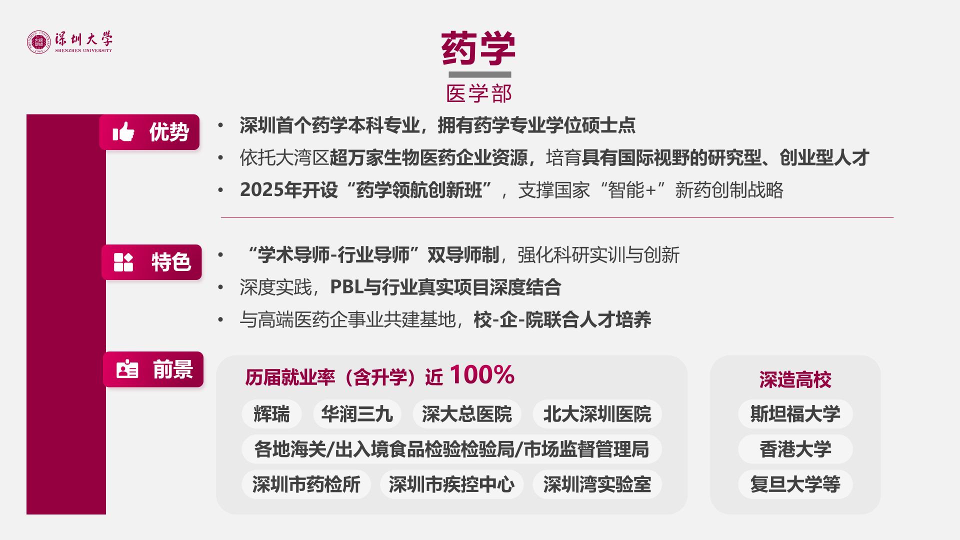 就业率(含升学)近100%(辉瑞、华润三九等药企;深大总医院、北大深圳医院等;深圳市药检所、深圳市疾控中心、各地海关/出入境食品检验检验局/市场监督管理局等政府机构;深圳湾实验室等科研院所;斯坦福大学、港大、复旦等院校深造)