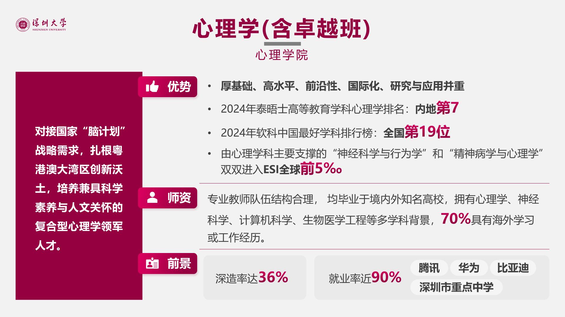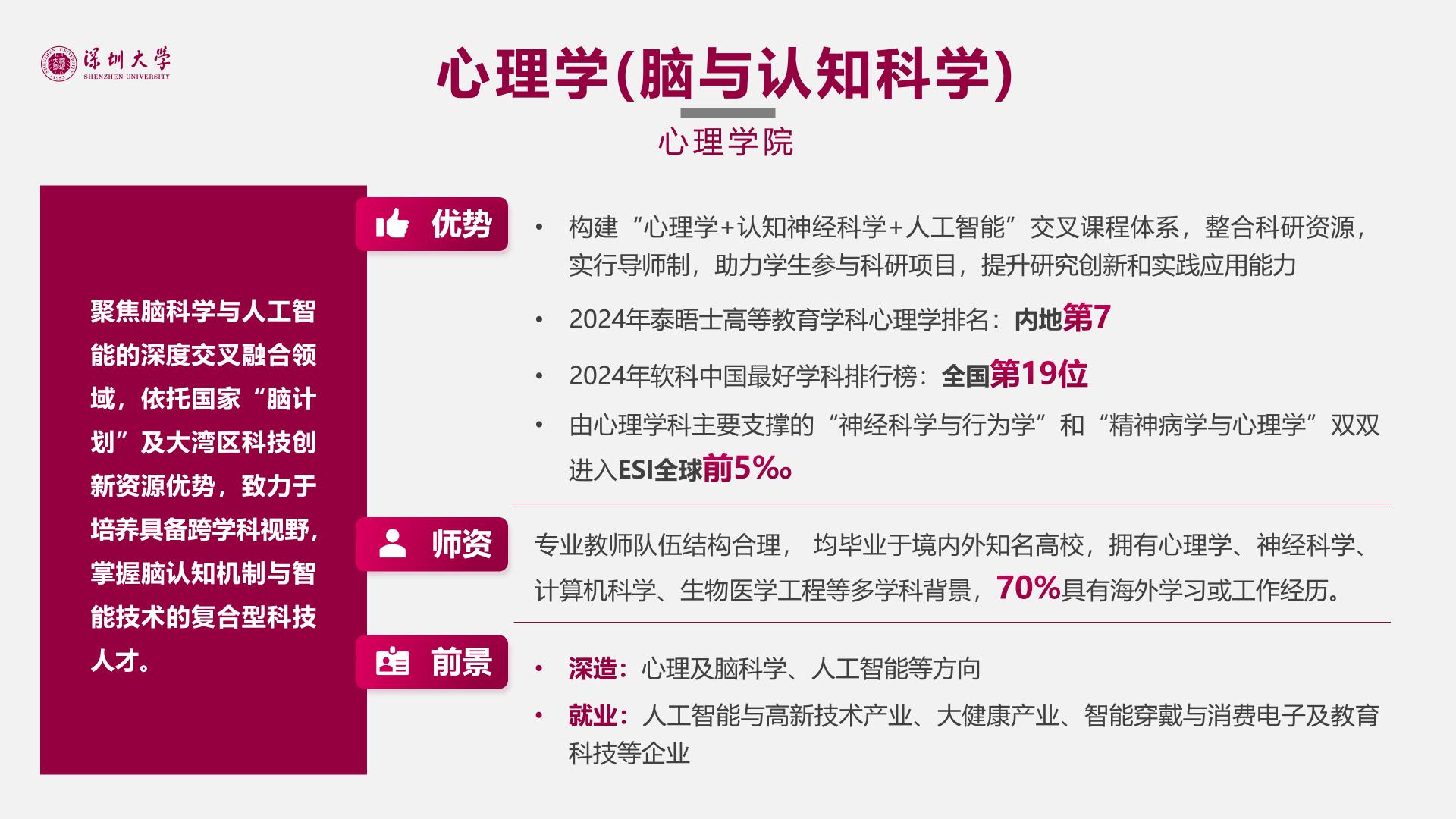 【就业深造】毕业生可在心理及脑科学、人工智能等方向继续深造,也可在人工智能与高新技术产业、大健康产业、智能穿戴与消费电子及教育科技等企业就业。