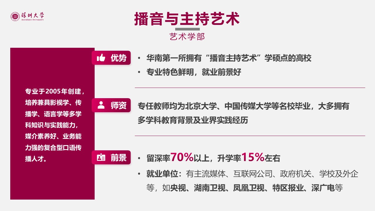 【就业深造】留深率70%以上,升学率15%左右,就业单位有主流媒体、互联网公司、政府机关、学校及外企等,如央视、湖南卫视、凤凰卫视、特区报业、深广电等。