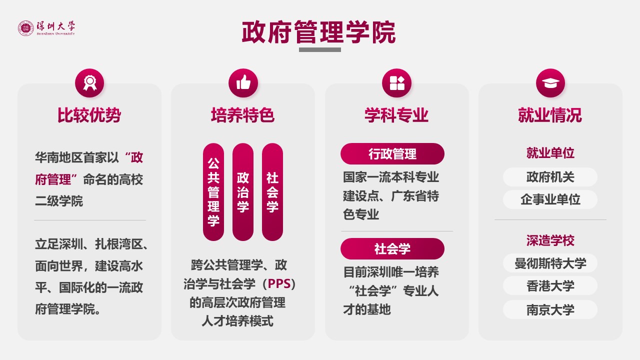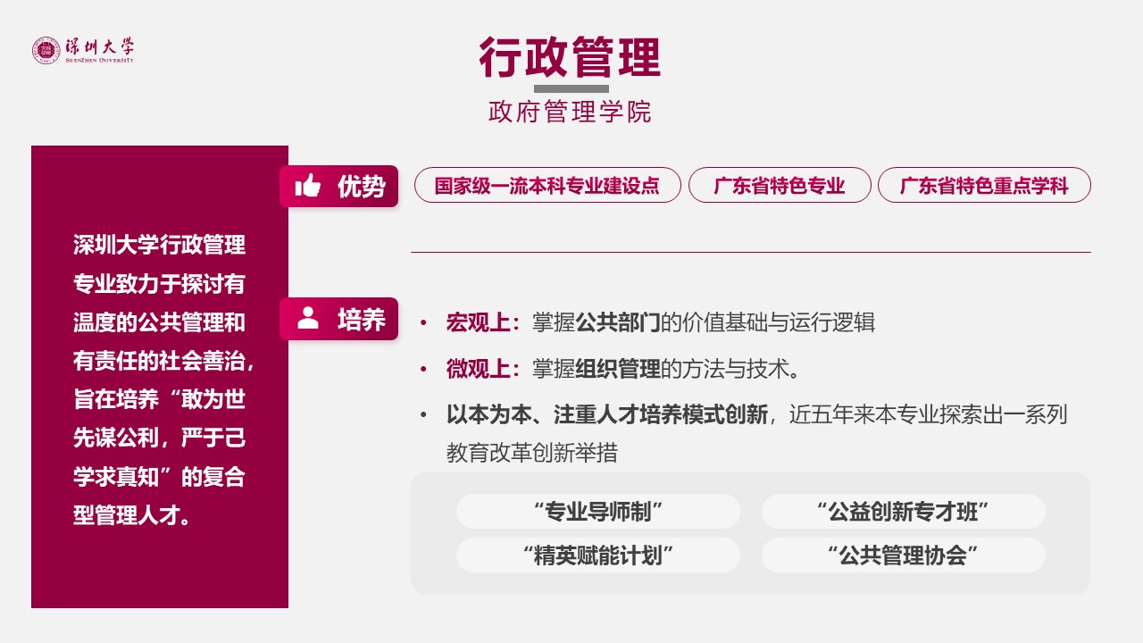 深圳大学行政管理专业致力于探讨有温度的公共管理和有责任的社会善治,旨在培养“敢为世先谋公利,严于己学求真知”的复合型管理人才。经过近四十年发展与沉淀,现为国家级一流本科专业建设点、广东省特色专业、广东省特色重点学科。行管人既需要从宏观上掌握公共部门的价值基础与运行逻辑,还需要从微观上掌握组织管理的方法与技术。以本为本、注重人才培养模式创新,近五年来本专业探索出“专业导师制”“精英赋能计划” “公益创新专才班” “公共管理协会”等一系列教育改革创新举措。