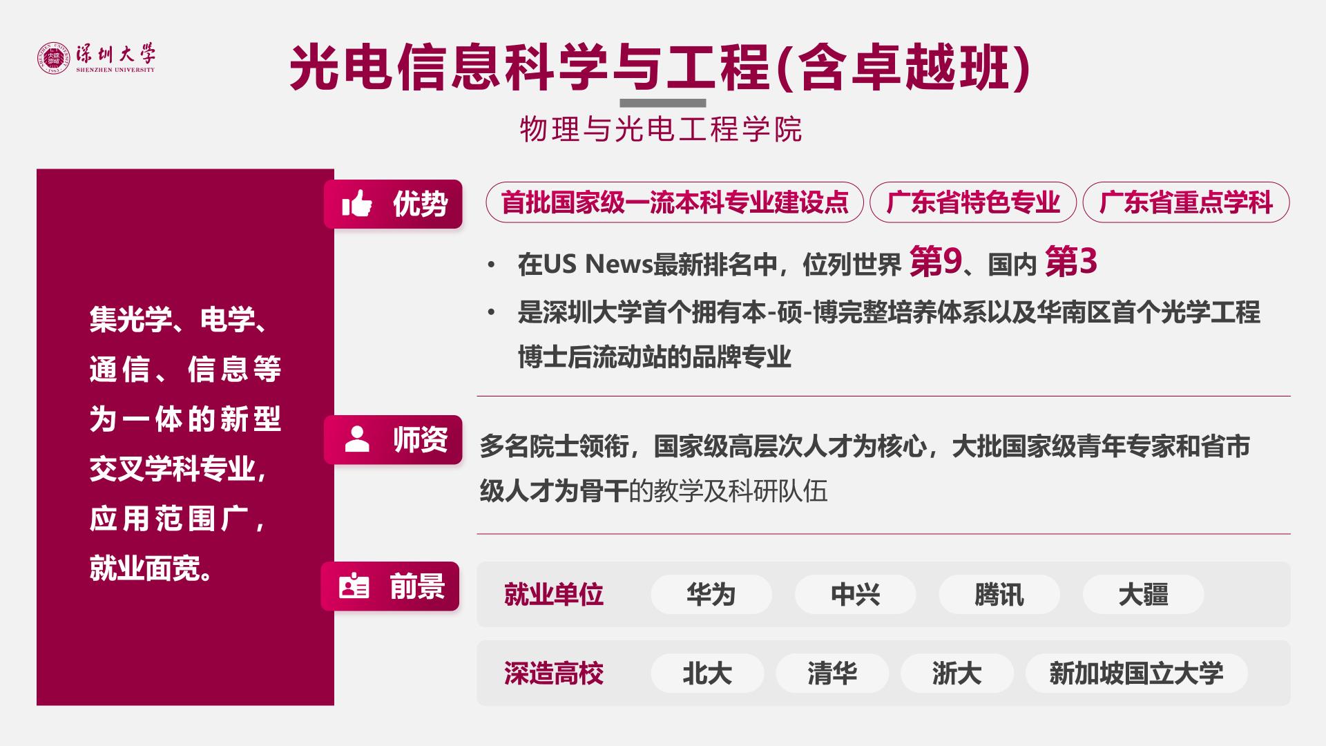 【简介】电子信息工程(文华班)由丁文华担任首席教授,作为深圳大学电子与信息工程学院本科教育改革的试验田,集中优势资源倾力打造,旨在培养电子信息理论及应用基础扎实、熟悉学科前沿领域、能够从事电子信息领域研究的拔尖创新人才。