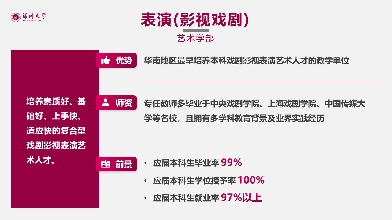 【优势】本专业是华南地区最早培养本科戏剧影视表演艺术人才的教学单位。