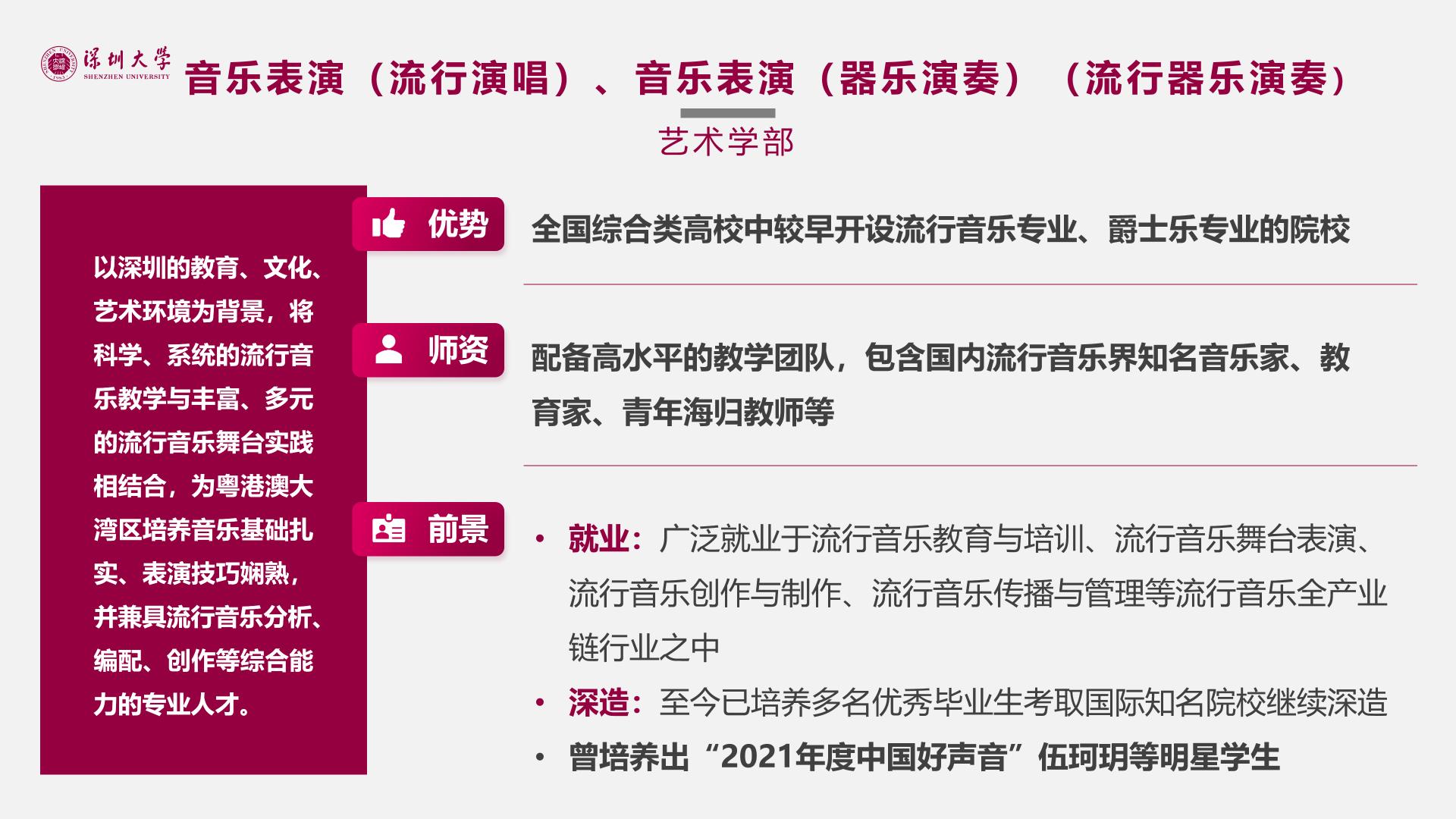 【简介】以深圳的教育、文化、艺术环境为背景,将科学、系统的流行音乐教学与丰富、多元的流行音乐舞台实践相结合,为粤港澳大湾区培养音乐基础扎实、表演技巧娴熟,并兼具流行音乐分析、编配、创作等综合能力的专业人才。