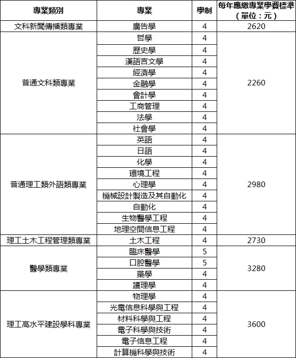 (一)學費(不含書費):按學分制收費,由課程學分學費和專業學費兩部分組成,每學期學生繳納學分學費按學生實際修讀的課程總學分計算(課程學分學費的標準為每學分100元)。