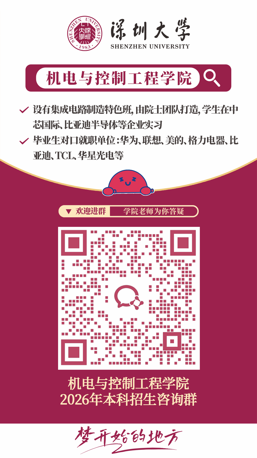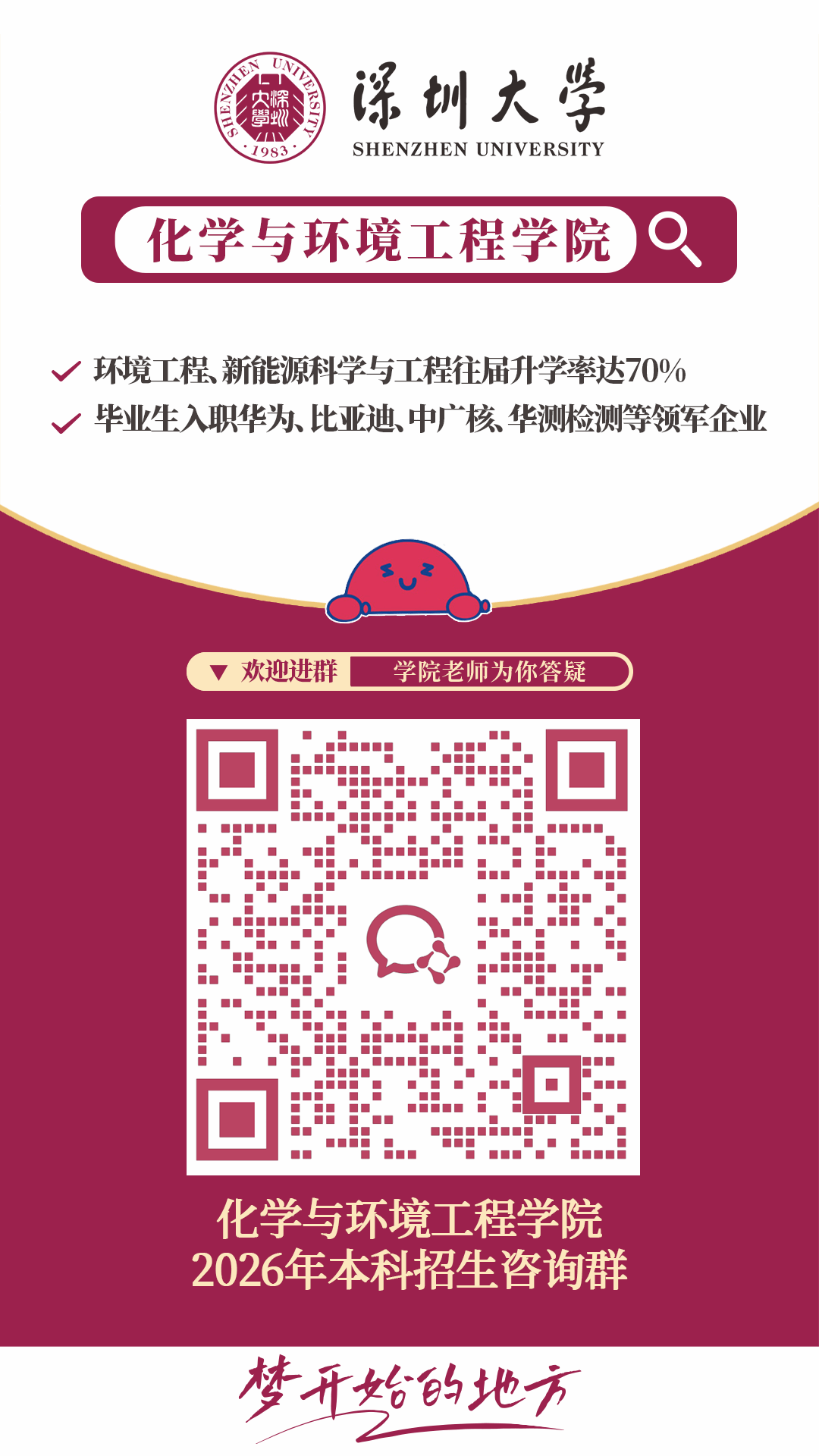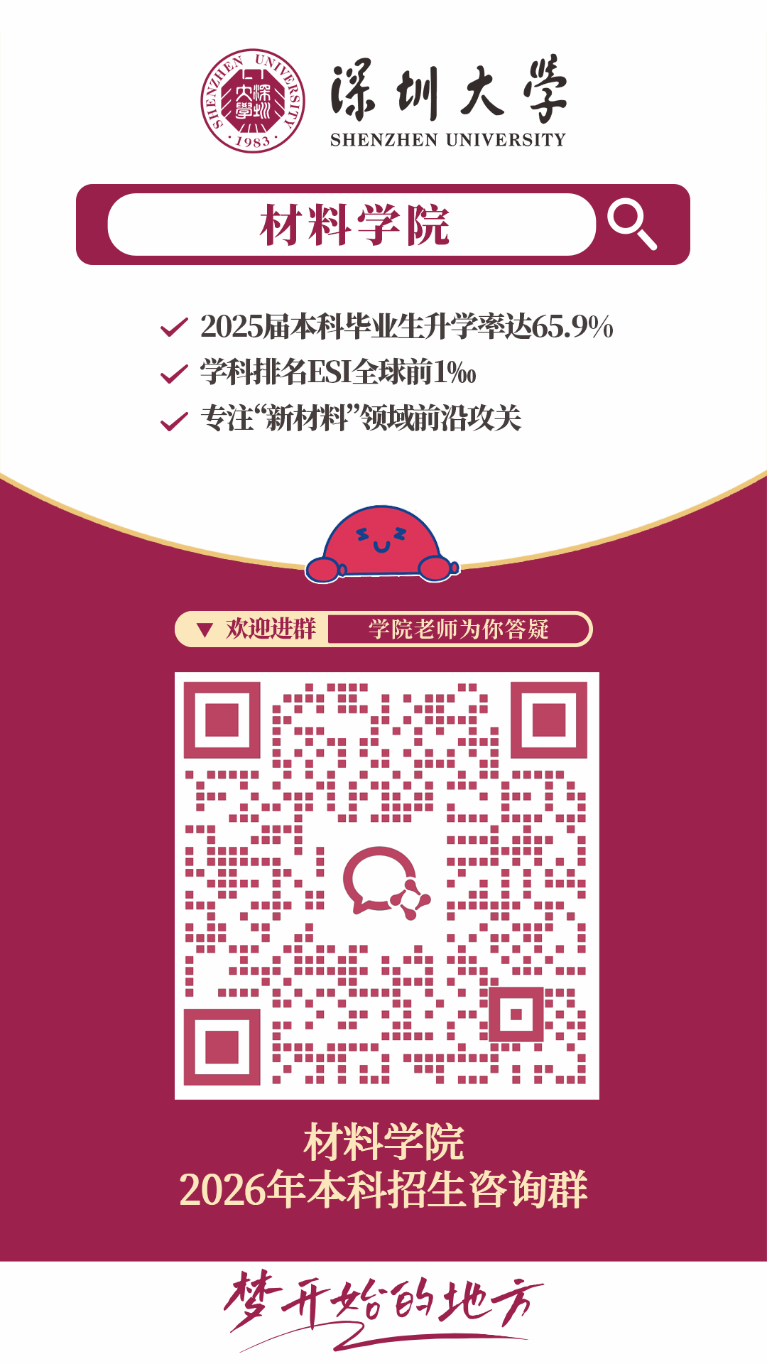 在这里,创新实验班、微专业,聚徒教学、小班制开课、学业导师制,院士、特聘教授亲自授课、手把手指导,高精尖的科研实践平台和设备、丰厚的大湾区创新创业沃土、多彩的国外学习交流合作项目,终将铸就您的“材”华横溢,“料”定未来。深圳大学材料学院欢迎您,梦想您,成就您。