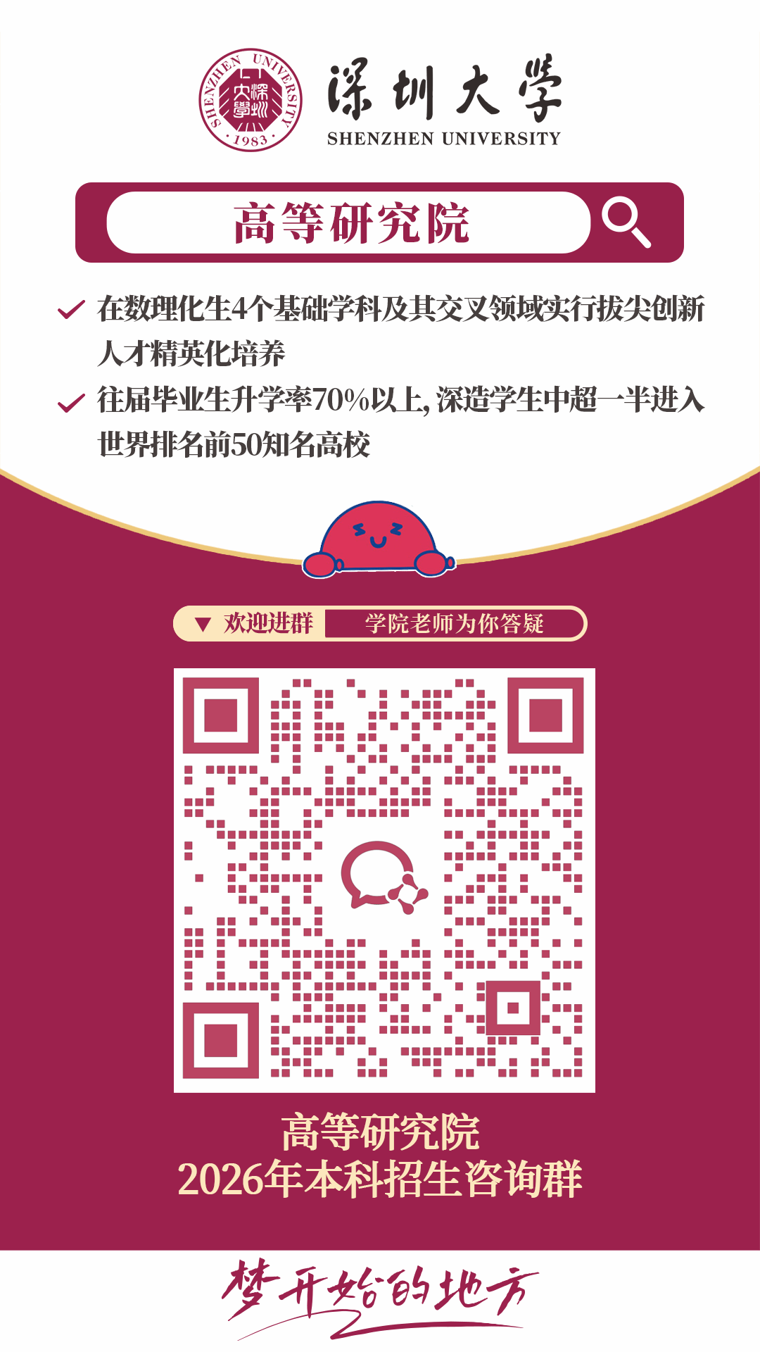 骄年之年,盛夏之夏。诸君历几载寒暑,凭孤月秋光,今剑锋出鞘,笔触绽放分形图腾,稿纸褶皱黎曼曲面,黄金榜上留名,蟾宫折桂有你。深圳大学数学科学学院,望能与诸君共窥宇宙先机,同赏数学妙意。格物岂惟公式间,数峰回转见云天。鹏城此去星辰近,解尽沧桑是少年。