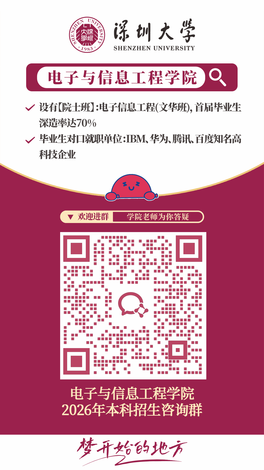 电子赋能生活,信息承载梦想;通信连接你我,网络互联万物。科技的力量正在以前所未有的速度改变世界,而电子信息类专业正是掌握这种力量的关键。在深圳大学电子与信息工程学院,我们将向大家呈现完整的电子信息知识体系。生动的课堂、有趣的实践、创新的培养模式助你快速成长。用电路板刻画梦想,让示波器映射希望,加入我们,一起“电”亮科创未来,逐梦“信”辰大海!