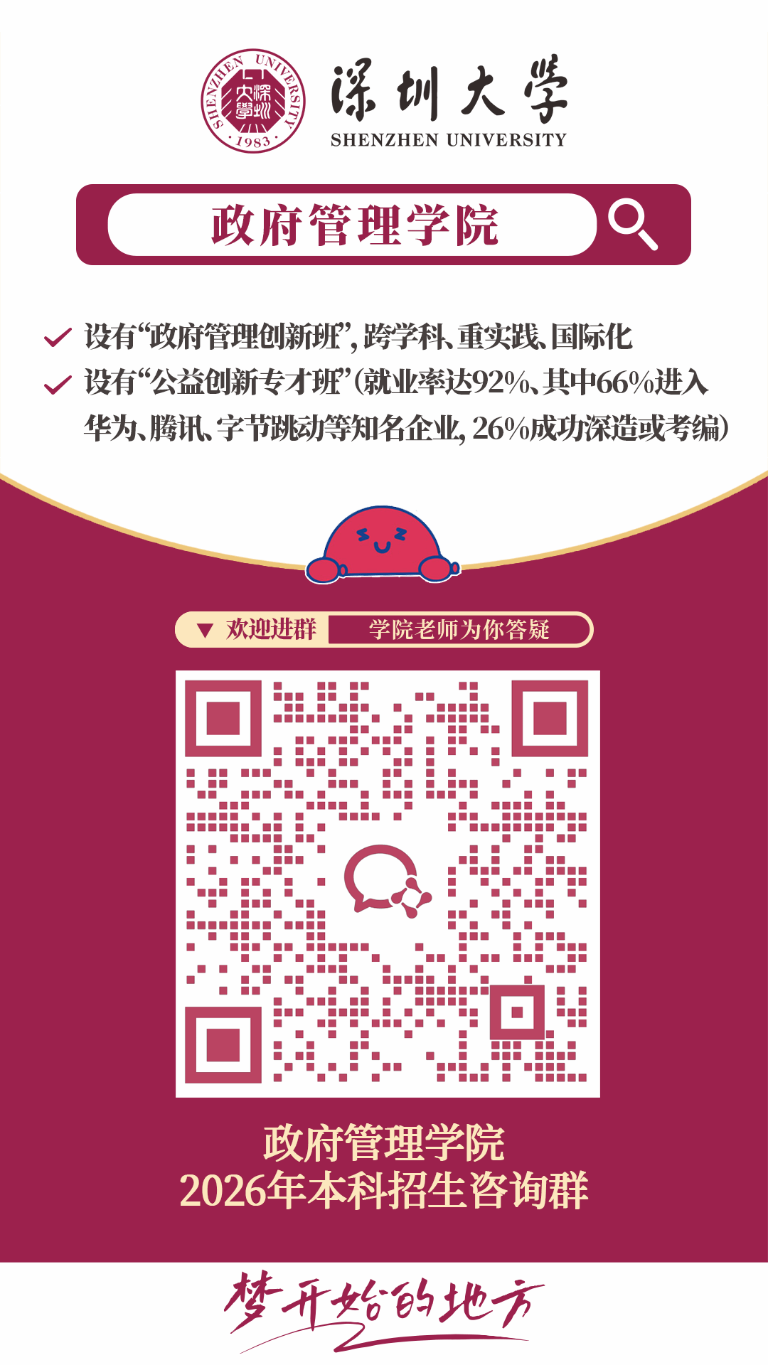 深圳大学政府管理学院,是华南地区首家以“政府管理”命名的高校二级学院。学院对标世界一流政府管理学院,高起点规划、高水平建设、高质量发展,探寻政府管理的中国之路,在世界治理格局中发出深圳声音。在这里,可以学习掌握城市治理、公共管理、社会发展等方面的前沿理论知识,可以深度参与政府机关、企事业单位、社区和公益团体的实践运作。学院文理科学生兼收,欢迎对国家与社会发展有兴趣、抱负的同学报考!