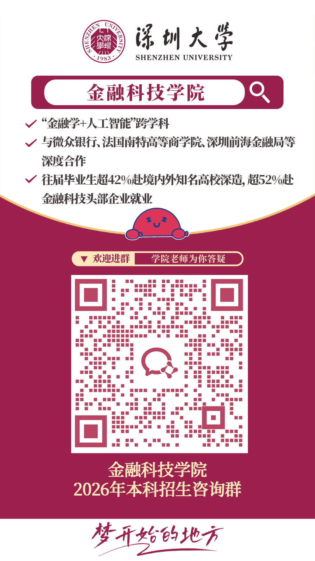 让科技给金融以力度,用金融传递科技温度。这里是梦开始的地方,无论你来自何处,都能在这里探索金融科技学科的知识海洋,掌握金融科技行业的前沿动态,激发创新实践的思维活力,收获不断成长的全新自我。这里,不设限;这里,欢迎你来挑战无限可能。