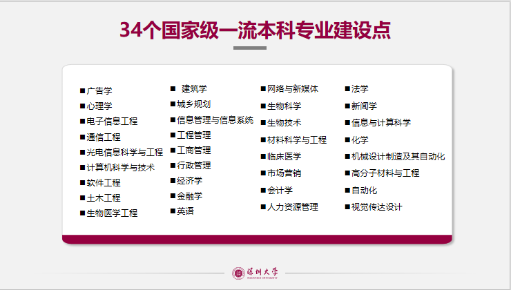 【关于优势专业】:深圳大学有34个国家一流本科专业建设点;21个广东省一流本科专业建设点。