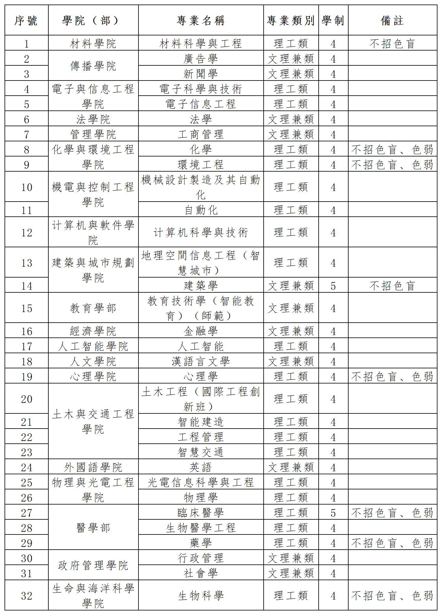 (二)招生專業詳見下表(最終以報名系統公佈為準)。