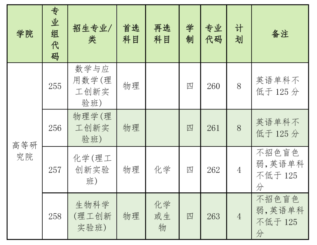 1. 学科设置。侧重跨学科教学和研究,在数学与应用数学、物理学、化学和生物科学等基础学科及其交叉领域(金融数学、功能材料、海洋资源与环境、生物技术与健康等)开展人才培养和科学研究。“理工创新实验班”本科前两年不分专业,跨学科、重基础培养,后两年按学生志愿和特长分专业培养。