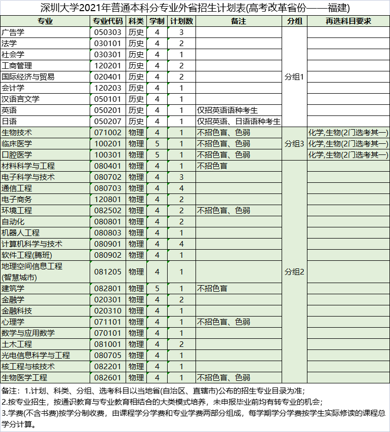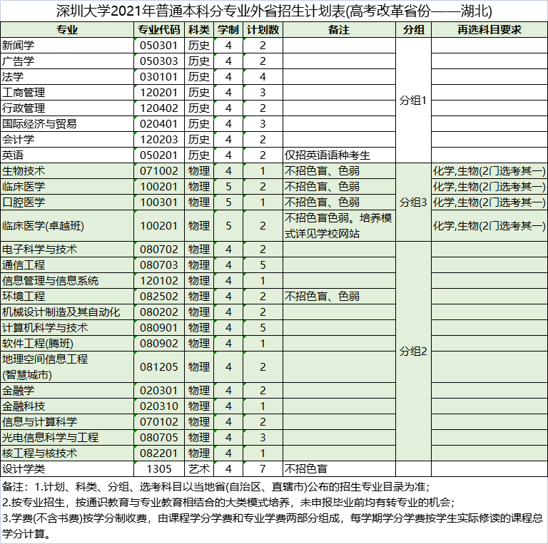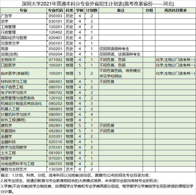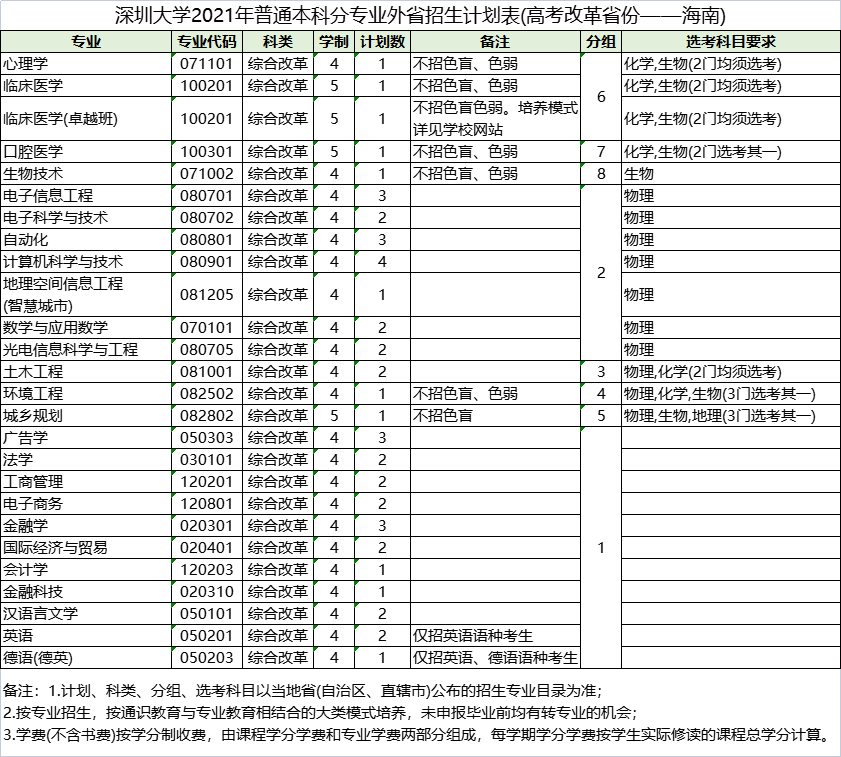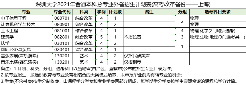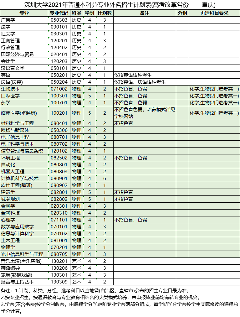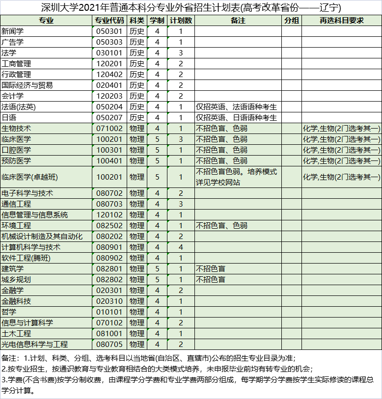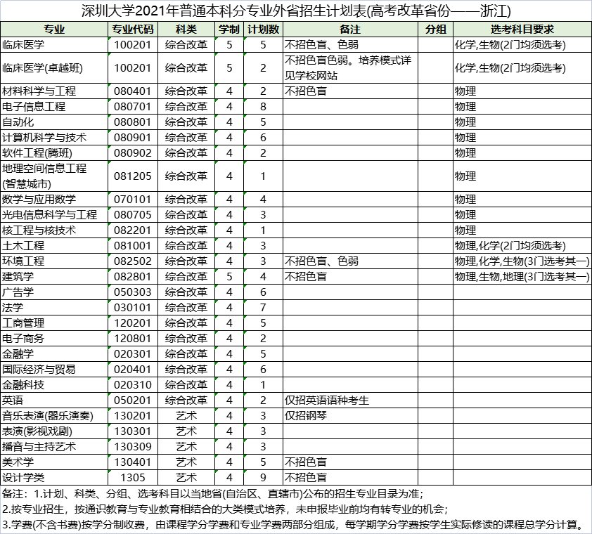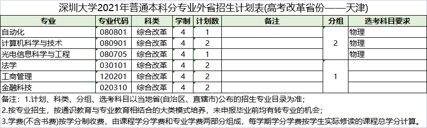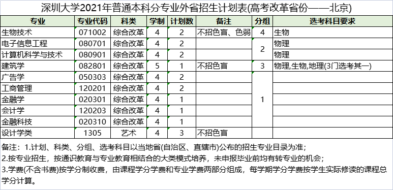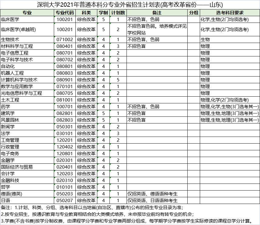 深圳大学2021年普通本科分专业外省招生计划表(3+3高考改革省份) |