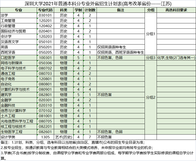 深圳大学2021年普通本科分专业外省招生计划表(3+1+2高考改革省份) |