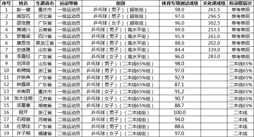 根据教育部办公厅《关于做好2021年普通高校部分特殊类型招生工作的通知》(教学厅〔2020〕13号))及《深圳大学2021年高水平运动队及保送录取运动员招生简章》等文件的有关规定,经研究决定,我校2021年高水平运动队单考单招文化课成绩最低录取分数线为总分180分,现将入围名单及拟录取层次安排再予以公示。按照教育部有关文件要求,拟定结果将上报教育部,并在教育部“阳光高考”平台(http://gaokao.chsi.cn)进行集中公示,最终合格名单以“阳光高考”平台审核公布为准,录取时按《深圳大学2021年高水平运动队及保送录取运动员招生简章》公布的录取原则执行。