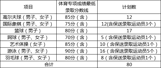 2.文化成绩最低录取控制线为180分。对具备一级运动员技术等级资格的考生,可在文化成绩最低录取控制线下降低30分录取;对具备运动健将技术等级资格的考生,可在文化成绩最低录取控制线下降低50分录取。