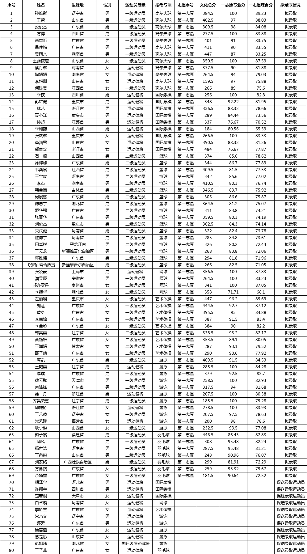 按照以上确定的最低录取分数线和录取原则,结合今年第一志愿报考我校且上线的考生情况,综合考虑我校招生运动项目建设和发展的需求,经研究决定,我校2021年运动训练专业拟录取符合条件的考生80名(含11名保送录取运动员),现将拟录取名单予以公示。