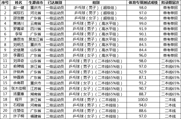 根据教育部有关文件及《深圳大学2021年高水平运动队及保送录取运动员招生简章》的有关规定,结合我校高水平运动队建设发展的需求,经研究决定,认定以下21名考生获得我校2021年高水平运动队入围资格,现将入围名单及拟录取层次安排予以公示。按照教育部有关文件要求,拟定结果将上报教育部,并在教育部“阳光高考”平台(http://gaokao.chsi.cn)进行集中公示,最终合格名单以“阳光高考”平台审核公布为准,录取时按《深圳大学2021年高水平运动队及保送录取运动员招生简章》公布的录取原则执行。
