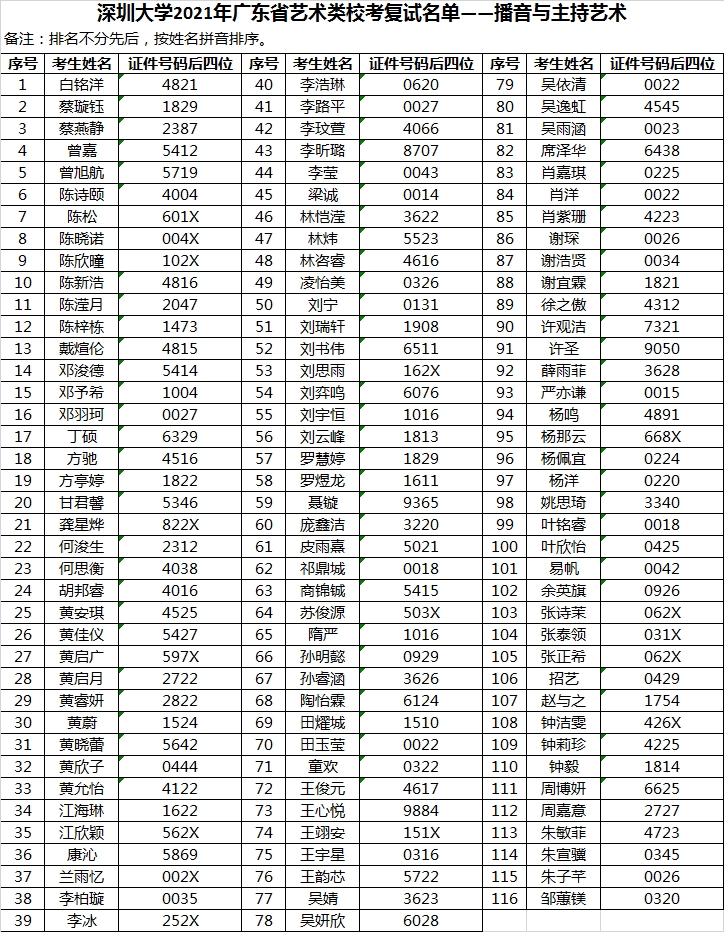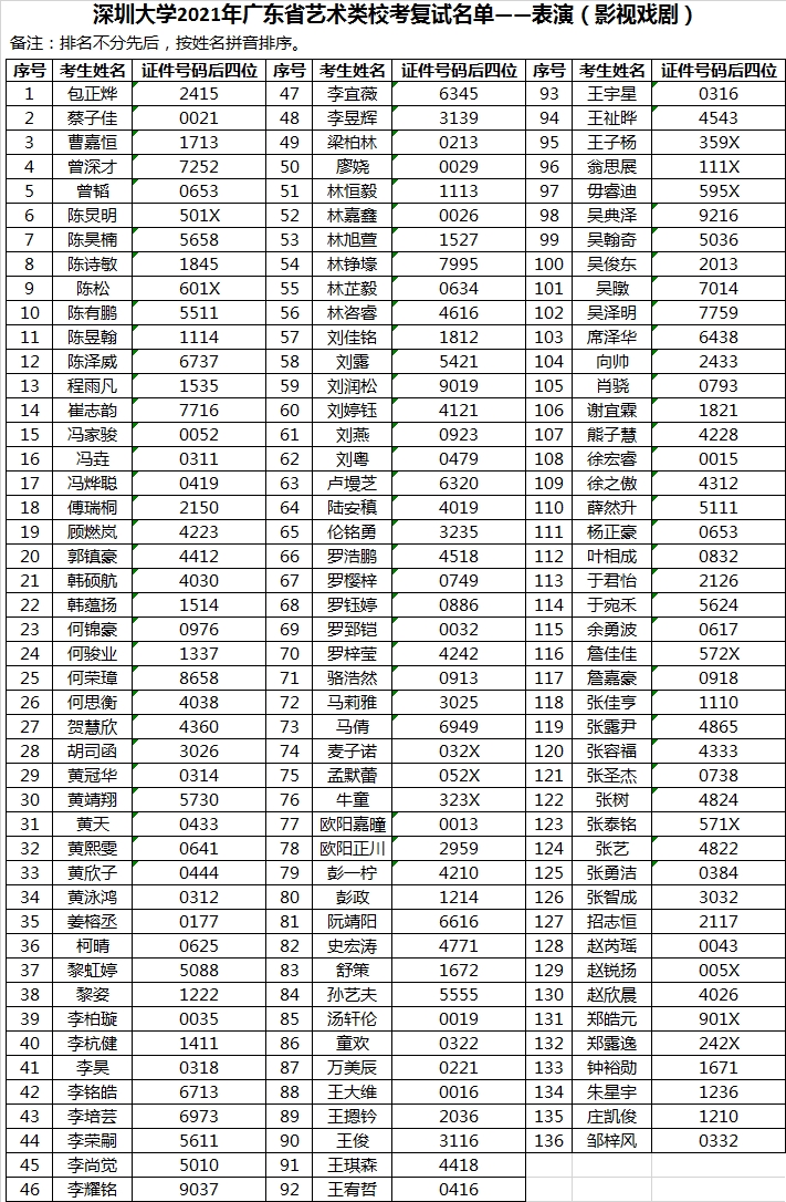 深圳大学2021年广东省艺术类校考复试名单公布如下,公示期为五日。我校校考各专业的复试人数不超过当年分省计划总数的4倍(广东省2021年表演(影视戏剧)招生计划34人、播音与主持艺术招生计划29人)。