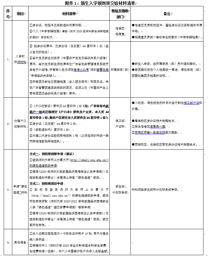 (4)需要办理户口迁移的新生,请于2020年9月30日前将相关户籍资料(见附件1)交至深圳大学户证科(宜在迎新周内交验完毕)。