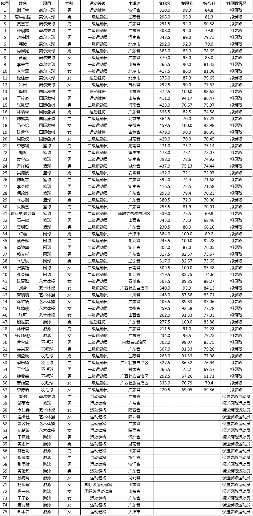 按照以上确定的最低录取分数线和录取原则,结合今年第一志愿报考我校且上线的考生情况,综合考虑我校招生运动项目建设和发展的需求,经研究决定,我校2020年运动训练专业拟录取符合条件的考生75名(含18名保送录取运动员),现将拟录取名单予以公示。