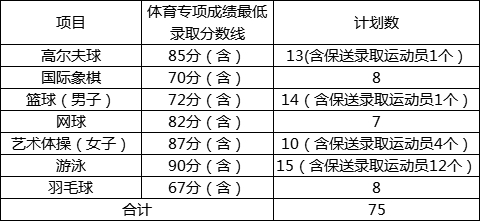 2.文化成绩最低录取控制线为180分。对具备一级运动员技术等级资格的考生,可在文化成绩最低录取控制线下降低30分录取;对具备运动健将技术等级资格的考生,可在文化成绩最低录取控制线下降低50分录取。