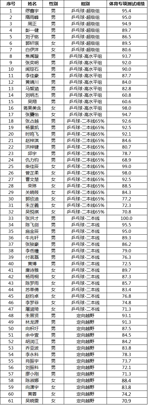根据《教育部高校学生司关于做好2020年普通高校特殊类型招生工作的通知》(教学司﹝2019﹞10号)、《深圳大学2020年高水平运动队及保送录取运动员招生简章》等文件精神,我校于2020年7月12-13日对符合我校高水平运动队考试资格的88名考生进行了体育专项测试,现将体育专项测试合格考生名单予以公示。