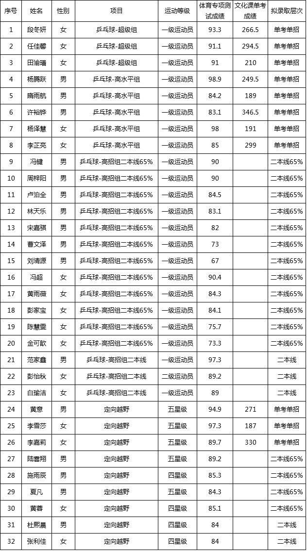 根据《教育部办公厅关于做好2019年普通高等学校部分特殊类型招生工作的通知》(教学厅﹝2018﹞13号)文件精神和《深圳大学2019年高水平运动队及优秀运动员免试生招生简章》的有关规定,结合我校高水平运动队建设发展的需求,经研究决定,我校2019年高水平运动队单考单招文化课成绩最低录取分数线为总分180分,同时认定以下32名考生获得我校2019年高水平运动队入围资格,现将入围名单及拟录取层次安排予以公示。按照教育部有关文件要求,拟定结果将上报教育部,并在教育部“阳光高考”平台(http://gaokao.chsi.cn)进行集中公示,最终合格名单以“阳光高考”平台审核公布为准,录取时按《深圳大学2019年高水平运动队及优秀运动员免试生招生简章》公布的录取原则执行。