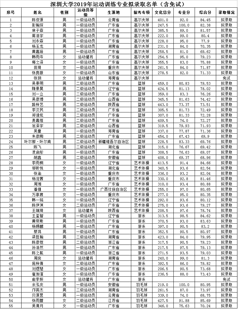 按照以上确定的最低录取分数线和录取原则,结合今年第一志愿报考我校且上线的考生情况,综合考虑我校招生运动项目建设和发展的需求,经研究决定,我校2019年运动训练专业拟录取符合条件的考生55名(含2名申请免试入学的优秀运动员),现将拟录取名单予以公示。
