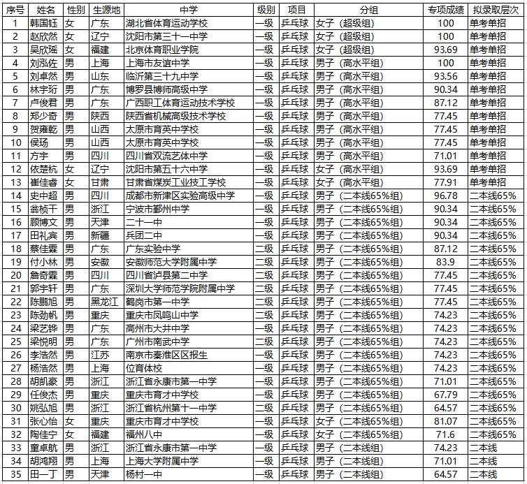 根据教育部有关文件及《深圳大学2022年高水平运动队及保送录取运动员招生简章》的有关规定,结合我校高水平运动队建设发展的需求,经研究决定,认定以下35名考生获得我校2022年高水平运动队入围资格,现将入围名单及拟录取层次安排予以公示。按照教育部有关文件要求,拟定结果将上报教育部,并在教育部“阳光高考”平台(http://gaokao.chsi.cn)进行集中公示,最终合格名单以“阳光高考”平台审核公布为准,录取时按《深圳大学2022年高水平运动队及保送录取运动员招生简章》公布的录取原则执行。