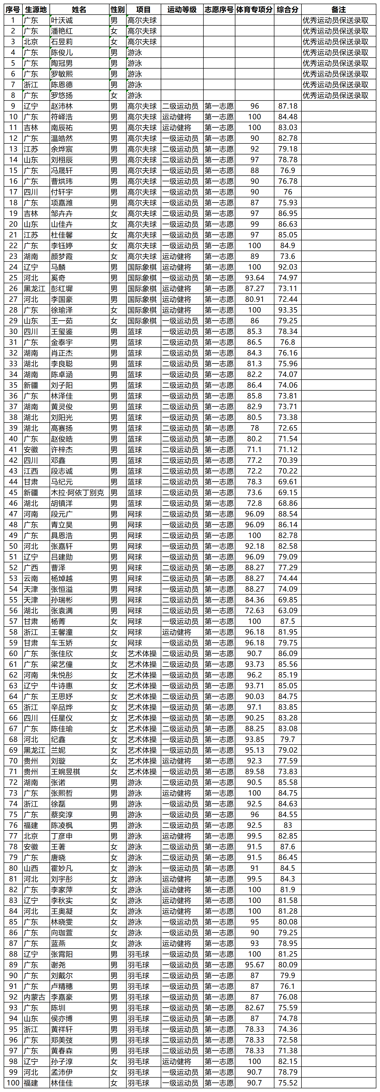 按照以上确定的最低录取分数线和录取原则,结合今年第一志愿报考我校且上线的考生情况,综合考虑我校招生运动项目建设和发展的需求,经研究决定,我校2022年运动训练专业拟录取符合条件的考生100名(含8名保送录取运动员;不含上海市同等条件延缓录取考生),现将拟录取名单予以公示。 最终录取结果以国家体育总局和各省、市、自治区考试院审核为准。