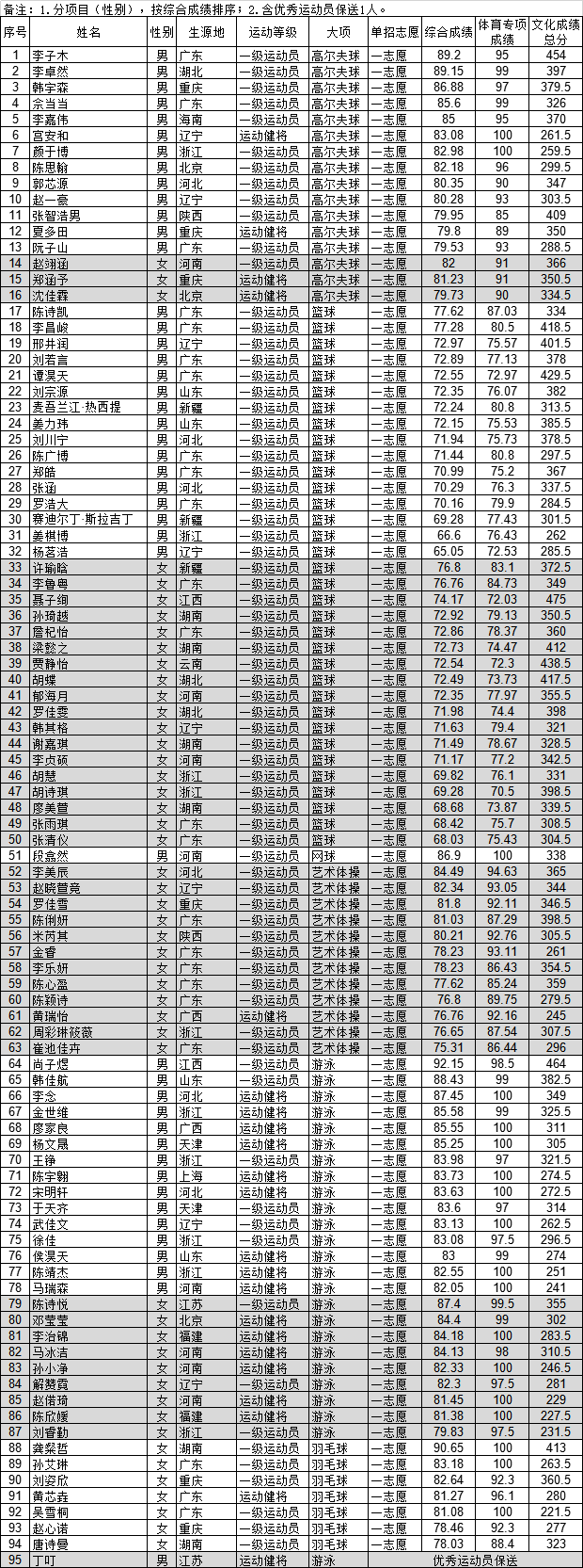 二、一志愿拟录取名单,共95人(含保送录取运动员1人),具体如下。 最终录取结果以国家体育总局和各省、市、自治区考试院审核为准。