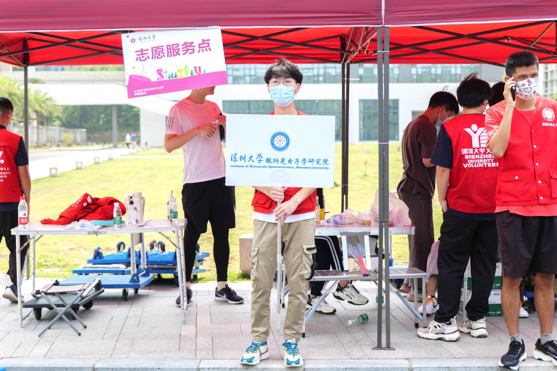 “同学需要帮忙吗?”“大家下车时记得把行李带好”……从早上7点到晚上9点,校园各处都能看到“红马甲”“蓝马甲”忙碌的身影:接引学生的,搬运行李的、答疑解惑的……在服务过程中,志愿者们会热心为新生介绍、讲解深大学习生活各方面的情况,消除新生对陌生环境的紧张感,“以心迎新”,新生们在志愿者身上感受到了第一份来自深大的温暖。