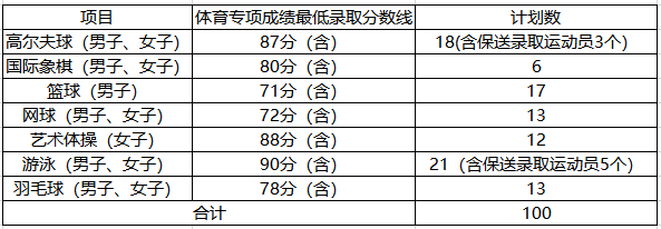 一、拟录取考生的体育专项考试成绩须达到合格(60分)及以上,在此基础上我校将依据招生项目的计划、要求和组织运动队的需求等综合因素,分项目、分男女划定体育专项考试成绩最低录取控制线,具体如下:
