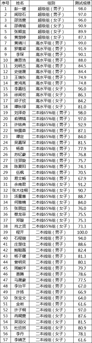 根据教育部有关文件及《深圳大学2021年高水平运动队及保送录取运动员招生简章》,我校于2021年1月19—20日对符合我校高水平运动队考试资格的63名乒乓球项目考生进行了体育专项测试,现将体育专项测试成绩合格考生名单予以公示。
