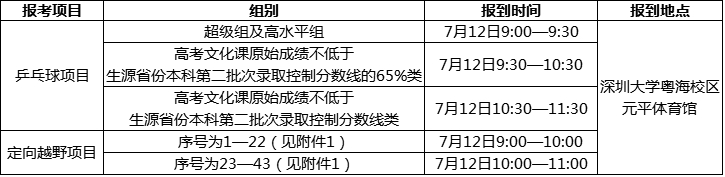 注:请报考乒乓球项目高招组的考生提前确定类别(高考文化课原始成绩不低于生源省份本科第二批次录取控制分数线的65%类或高考文化课原始成绩不低于生源省份本科第二批次录取控制分数线类),并于指定时间段到校报到。