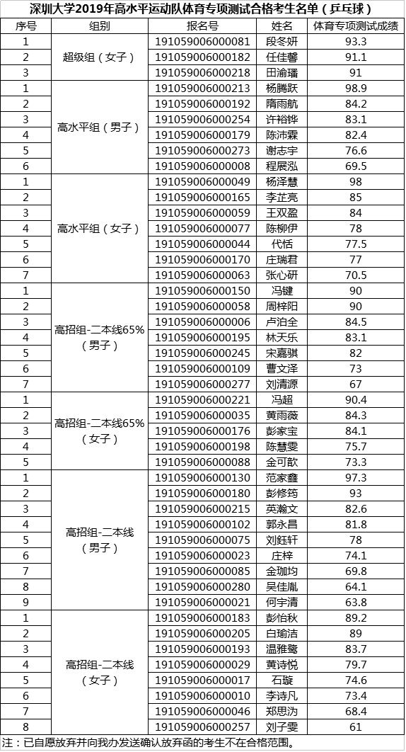 根据《教育部办公厅关于做好2019年普通高等学校部分特殊类型招生工作的通知》(教学厅﹝2018﹞13号)、《深圳大学2019年高水平运动队招生简章》等文件精神,我校于2019年2月23日对符合我校高水平运动队考试资格的171名考生进行了体育专项测试,现将体育专项测试合格考生名单予以公示,公示期为2019年3月2—6日。对成绩有疑问者,请于公示期内提出核查,逾期不予受理。