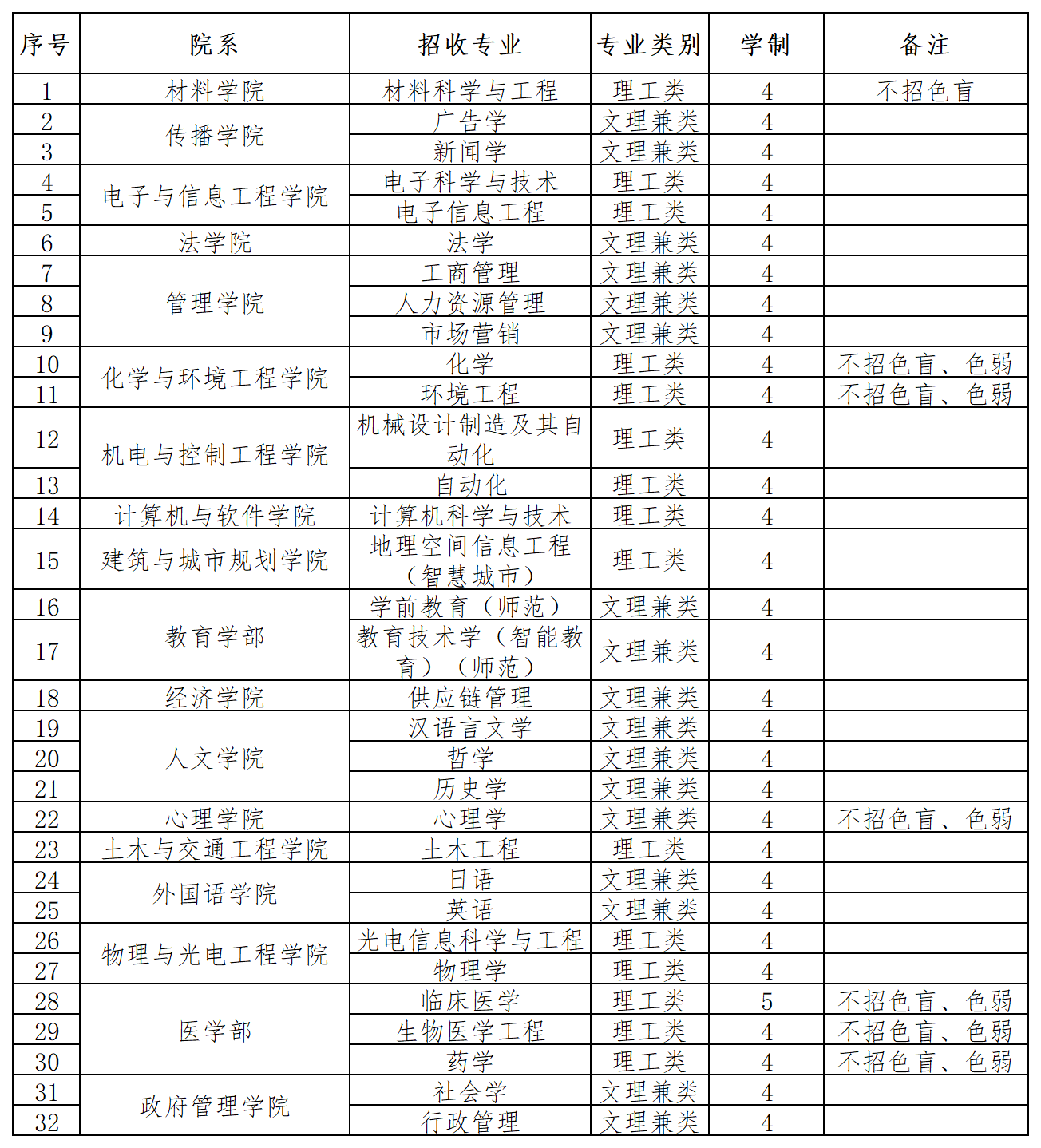 具体招生专业详见下表(最终以报名系统公布为准)。专业介绍及专业受限请参阅“深圳大学全日制本科招生专业介绍”(https://zs.szu.edu.cn/xyzy1.htm)。