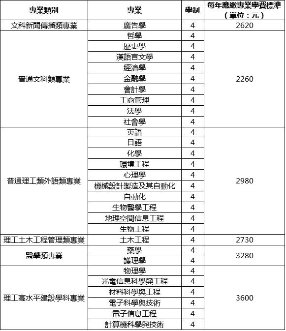 (一)學費(不含書費):按學分制收費,由課程學分學費和專業學費兩部分組成,每學期學生繳納學分學費按學生實際修讀的課程總學分計算(課程學分學費的標準為每學分100元)。